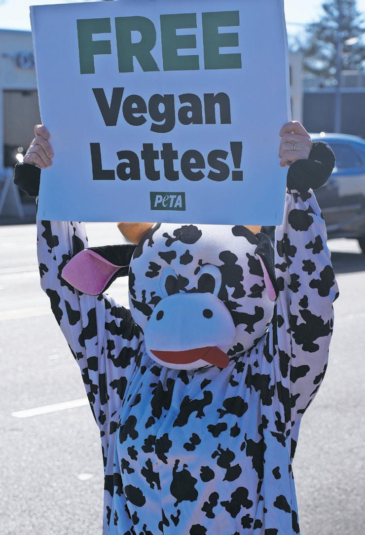 The animal rights activists partnered with People for the Ethical Treatment of Animals to protest Starbuck’s controversial vegan milk up charge in coffee and other beverages.