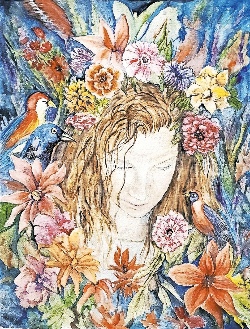 The first of the two artworks is a selfportrait entitled “Flowers & Feathers,” created in homage to Frida Kahlo. As someone who prefers to inspire and champion others, Kelly stepped out of her comfort zone for this work, and she lets the painting do the talking.