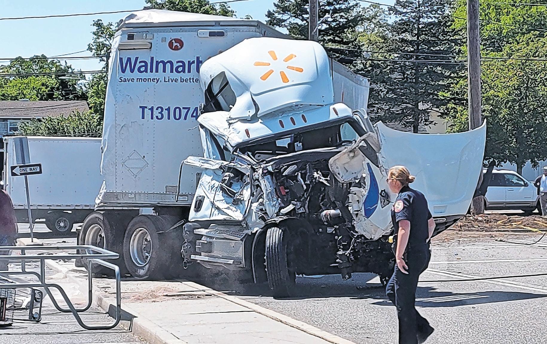 The operator of the tractor trailer did not stop and continued southbound, colliding with seven occupied vehicles near Stop & Shop on Jerusalem Avenue in Bellmore, before it overturned in the grocery store’s parking lot.