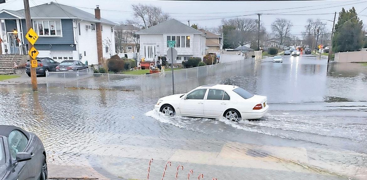 BELLmORE AND mERRick residents awoke to storm surge caused by a massive rainstorm Friday morning. Coastal neighborhoods experienced a lot of flooding, making travel very difficult. Residents reported that cars and buses had a hard time traveling to John F. Kennedy High School in the Bellmore-Merrick Central High School District due to the floodwaters. Left, an intersection near the high school, with a car plowing through the high water levels.