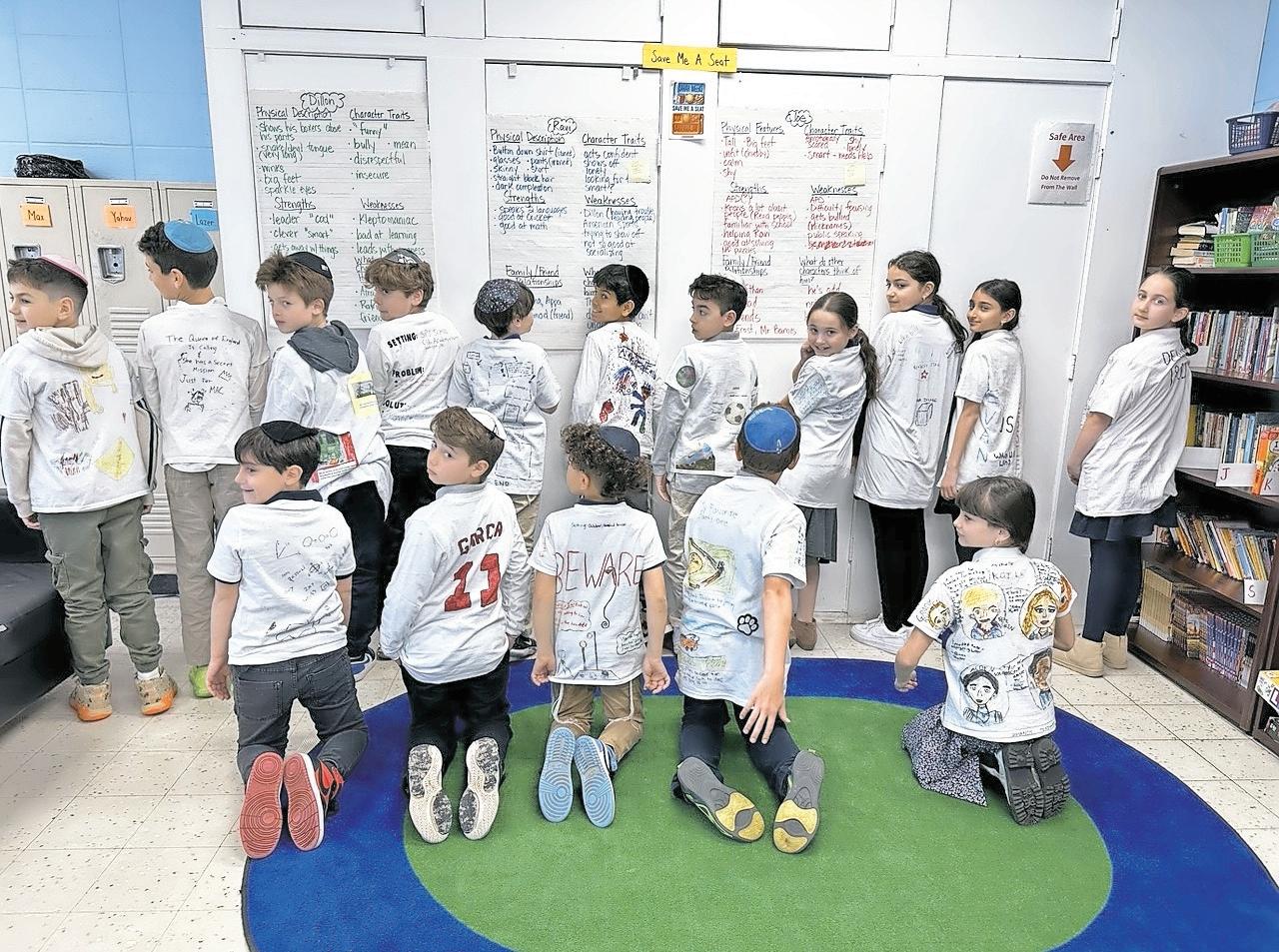 Fourth-graders at Brandeis Yeshiva in Lawrence show off their creative and artistic talents as the students displayed the shirts they designed. The shirts represent all different genres of books and interpretation of the book they were assigned.