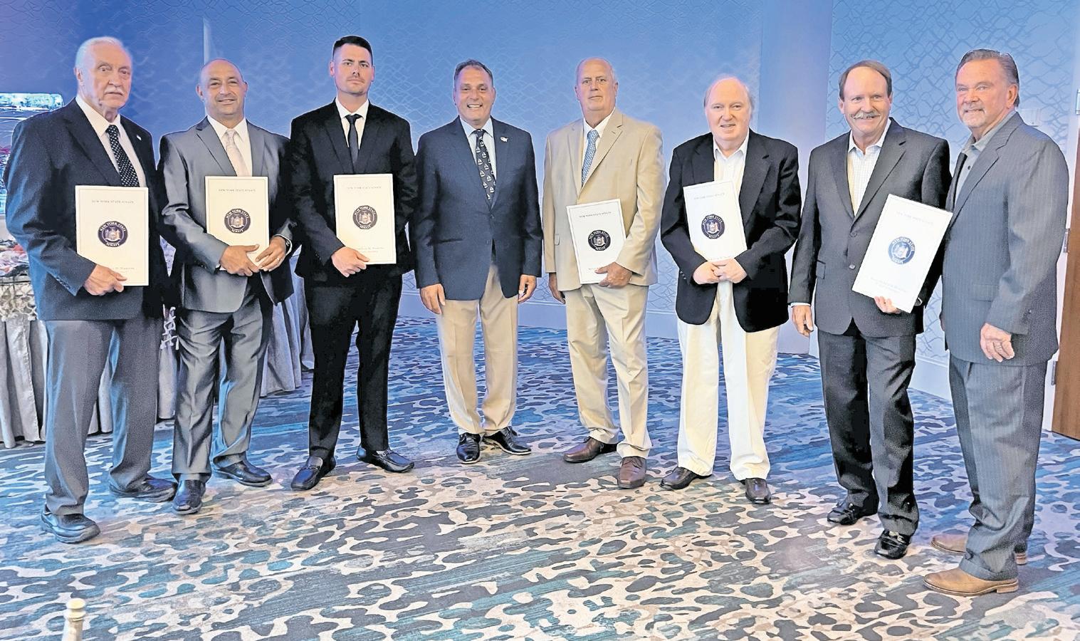 The Atlantic Steamer Fire Company of Oyster Bay recently held their Annual Installation Dinner. At the event, Joseph Saladino, Town of Oyster Bay supervisor, recognized outgoing ex-chiefs James Ceglia and Robert Mickman for their dedicated service to the department and presented them with official town citations.