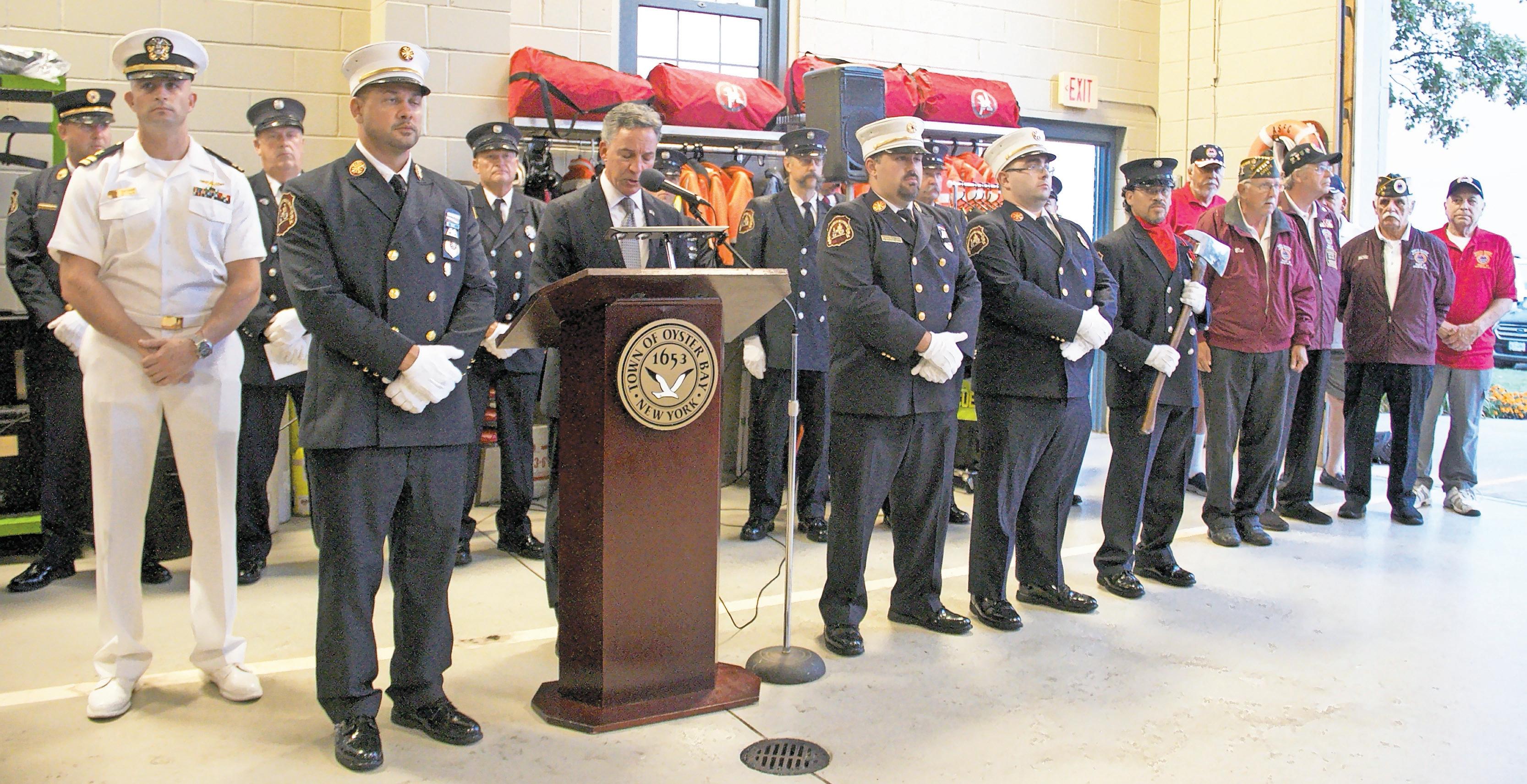 “Members of the Oyster Bay Fire Company and Atlantic Steamer are the kinds of people who are willing to run into danger when the rest of us run away,” Saladino said. “There’s another group of people who wish they weren’t here to show us the meaning of strength. They are here to honor the loved ones they lost.”