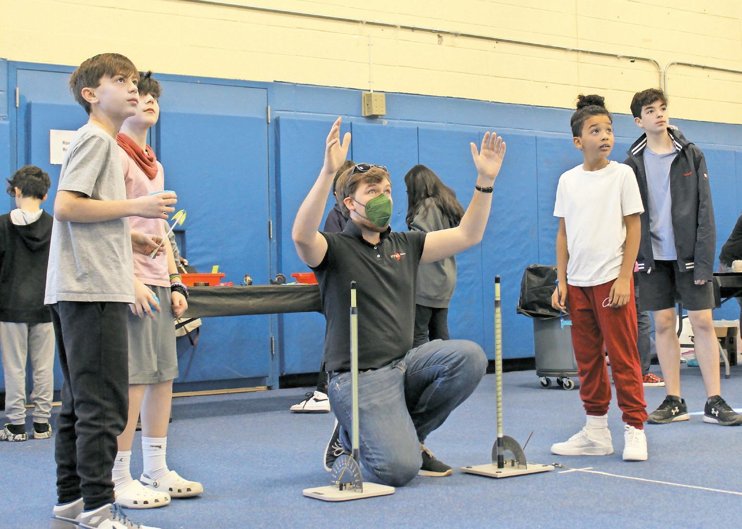 Karina Kovac/Herald photos EagEr EyEs surround Sebastian Muzeja, the Hall of Science programs assistant in charge of the rocket station, as sixth-graders test out their rockets.