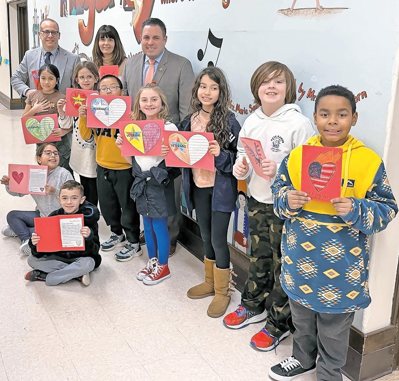 StudentS from School No. 8 sending Valentines to veterans proudly present their letters of appreciation alongside Congressman Anthony D’Esposito, principal Frank Zangari and staff.