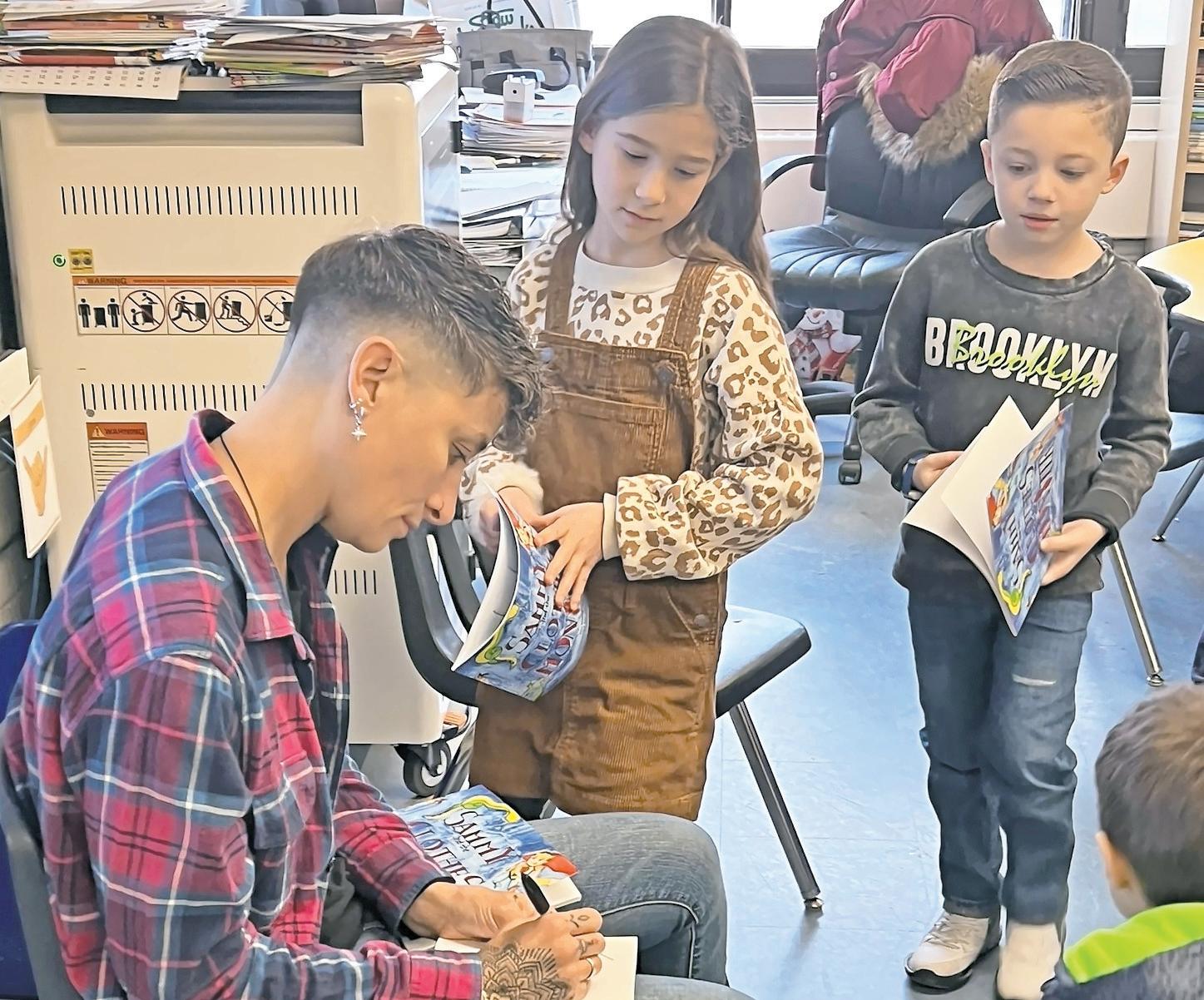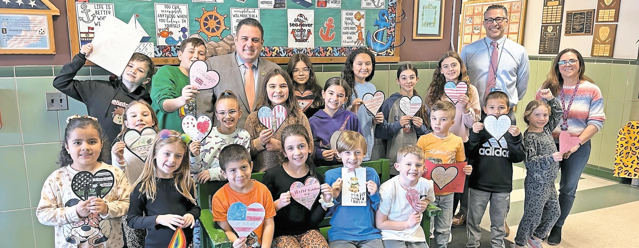 StudentS from the Francis X. Hegarty Elementary School smile wide while holding up their Valentines Day cards, alongside principal Bruce Hoffman, staff and Congressman Anthony D’Esposito.