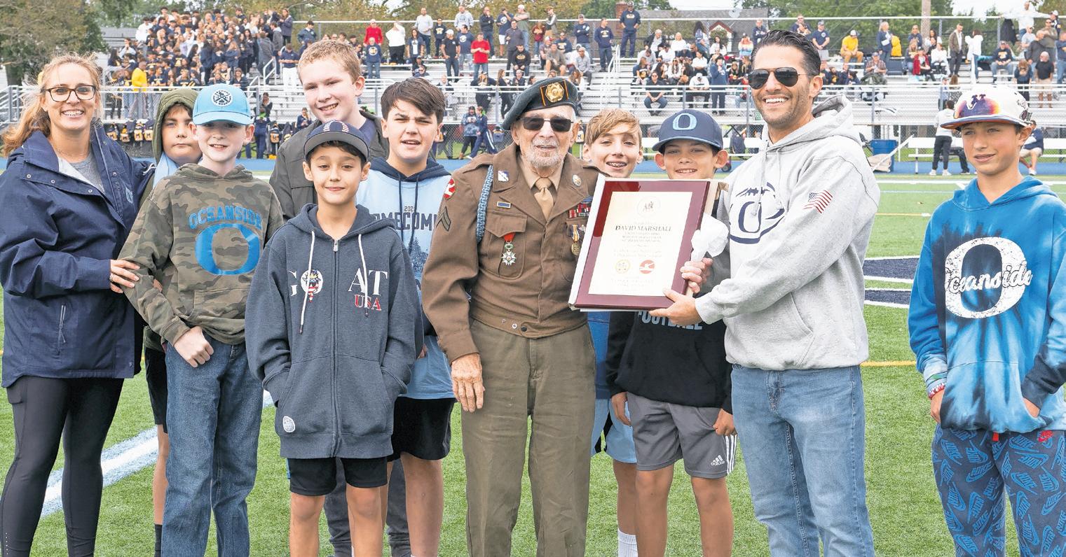 World War II veteran David Marshall was honored at halftime of Oceanside High School’s Homecoming game Saturday.
