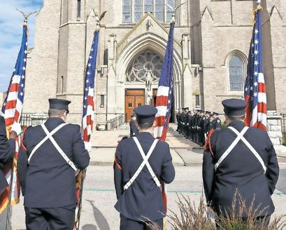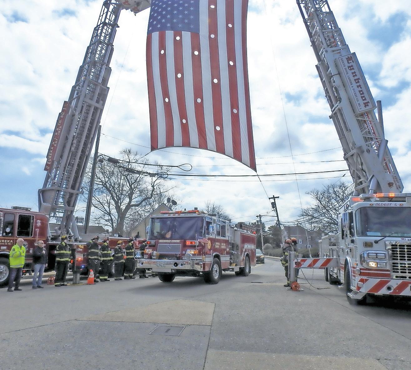 Tower ladder companies from Rockville Centre and Lynbrook raised a flag over S. Centre Avenue during the funeral procession.