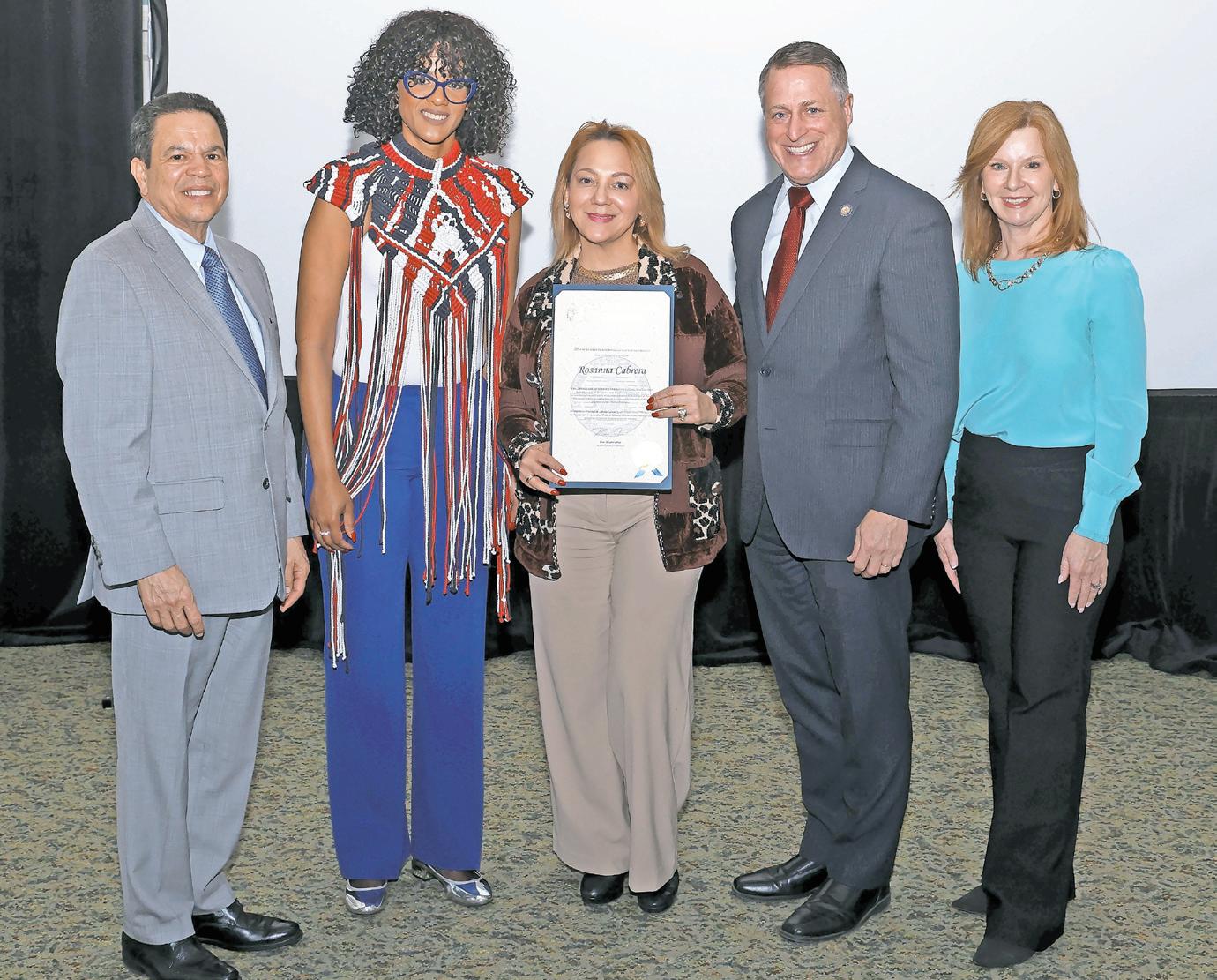 Charles Troici, one of the longest serving employees in the Village of Rockville Centre, is retiring after 44 years of service with the Department of Public Works. In recognition of his dedication and unwavering positivity, Village Trustee Emilio Grillo, left, Deputy Mayor Kathy Baxley, Mayor Francis Murray, Village Trustee Katie Conlon and Village Trustee Gregory Shaughnessy presented him with a plaque during the village meeting on March 4.