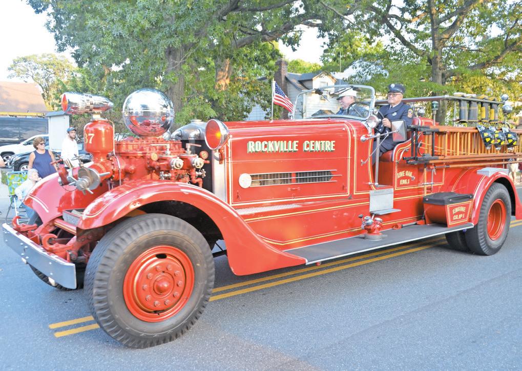 live oak engine Company No. 1 with the Rockville Centre Volunteer Fire Department truck along the parade route.