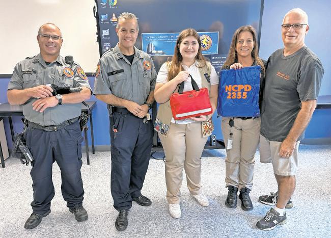 Photos courtesy Wantagh Fire Department Ashley Divver presents kits to several members from the Nassau Police Emergency Ambulance Bureau.