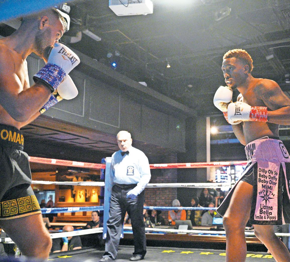 Iman Lee, near left, who is from Elmont, landed a right hand on Dom Breen. The fight was Breen’s pro debut, but was a quick night’s work for Lee.