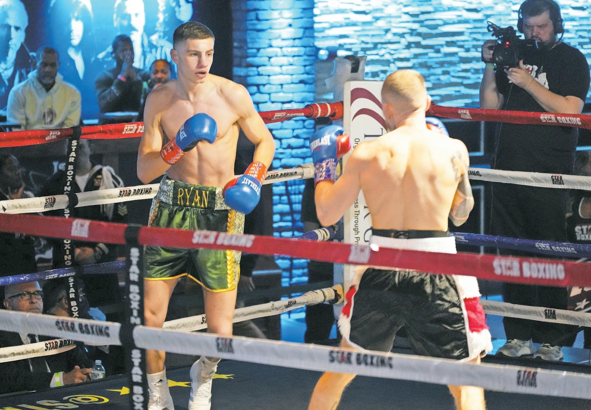 RYAN o’RouRKE, lEft, from Ireland, made his American boxing debut against Andreas Maier, of Germany, last Thursday at Mulcahy’s.