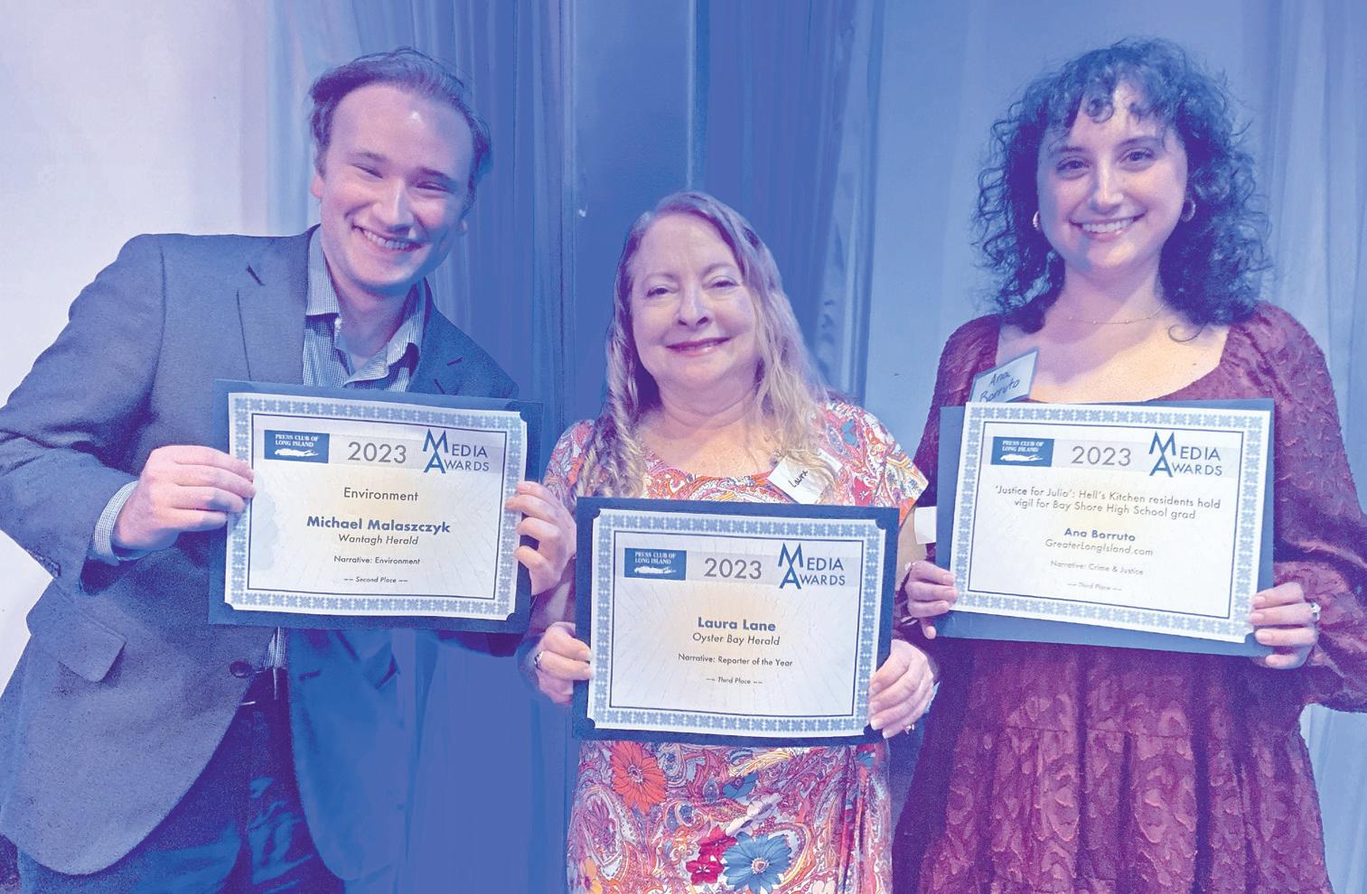 ThE PRESS Club of Long Island recognized journalism excellence at its annual dinner last week. Herald staffers Michael Malaszczyk, Laura Lane, center, and Ana Borruto show off their awards for the Wantagh Herald, Seaford Herald, Oyster Bay Herald and Franklin Square/Elmont Herald. Reine Bethany, editor of the Uniondale Herald Beacon, also was honored for her previous work with the Freeport Herald.