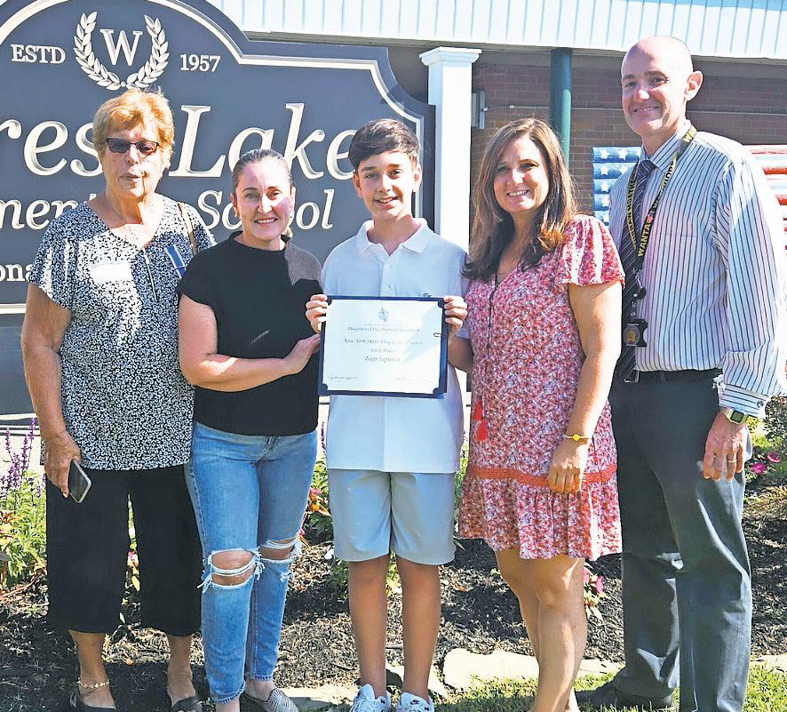 Katherine Kenney, Regent of the Jerusalem Chapter, left, stands with Mrs. Sapienza, Tiago Sapienza, teacher Katina Sullivan, and Forest Lake Elementary School Principal Thomas Burke. The Jerusalem Chapter of the Daughters of the American Revolution announced that Tiago Sapienza, a student at Forest Lake Elementary School in Wantagh, was the New York State DAR’s first-place overall winner in the elementary-level essay contest for his piece on ‘What the United States of America’s flag means to me.’