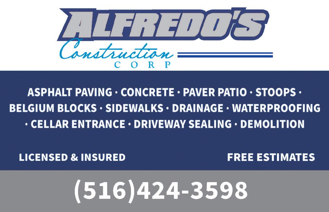 10 August, 2023 LIVING LARGE - Rockville Centre To Advertise Call 516-569-4444 x 250 218 N Long Beach Rd, Rockville Centre, NY 11570 r eli A ble! om DSCA R e QU e ST A QUOT e 516•442•2111 282A Sunrise Highway, Rockville Centre, NY 11570 11565 Kosher Restaurant & Caterers HUNGRY YET? OPENING! 2757 Long Beach Rd, Oceanside (next to Starbuck’s) 516-806-2188 Book Your Holiday Party Now! LIVE ENTERTAINMENT Thursday thru Saturday! (516) 561-3080 76 Rockaway Ave., Valley Stream, NY 11580 Elegance that stands out THE MARKET Introductory Offer $125 $250 Std Rate 5.375” x 4.75” The Market Competitively p ri C ed & AlwAys r eli A ble! 2757 Long Beach Oceanside (next to Starbuck’s) 516-806-2188 Holiday Party Now! LIVE ENTERTAINMENT Thursday thru Saturday! THE MARKET 218 N Long Beach Rd, Rockville Centre, NY 11570 & AlwAys r eli A ble! TURCIOS esigner design 917-691-7811 vid@vsroseslAndsCApe.Com VSROS e S l A n DSCA R e QU e ST A QUOT e Exceptional Dental Care 516•442•2111 282A Sunrise Highway, Rockville Centre, NY 11570 516•596•1919 Malverne, NY 11565 516•791•4033 1441 Broadway, Hewlett, NY 11557 HUNGRY YET? OPENING! 2757 Long Beach Rd, Oceanside (next to Starbuck’s) 516-806-2188 Book Your Holiday Party Now! LIVE ENTERTAINMENT Thursday thru Saturday! (516) 561-3080 76 Rockaway Ave., Valley Stream, NY 11580 THE MARKET 82423 1202643 INSECT & DISEASE MANAGEMENT FERTILIZATION & SOIL CARE PRUNING • CABLING & BRACING Kevin Siragusa, Arborist Representative 631-423-0090 bartlett.com 39 Allen Blvd., Suite A Farmingdale, NY 11735 The F. A. Bartlett Tree Expert Company Fully Lic/Ins # ALL PHASES OF TREE WORK Removals • Pruning • Trimming Hazard Tree Identification & Storm Damage Prevention Grading & Lawn Installations The Best for Less! • Over 33 Years Owner Operated by ISA Certified Arborist FREE ESTIMATES 631-254-0045 AAACheapTree.com • angieslist.com/review/243137 GUARANTEED BEST PRICE! AAA CHEAP TREE Nassau H3900100000 • Suffolk 45336-H DEMOLITION REMOVAL • CLEANUP WWW.1866WEJUNKIT.COM 516.541.1557 1-866-935-8654 FULLY LICENSED & INSURED: Nassau H3900100000 Suffolk 45336-H SAME DAY SERVICE FREE ESTIMATES ALL SIZE DUMPSTERS AVAILABLE 5, 10, 15, 20 & 30 Yard Sizes MENTION COUPON CODE: EXPRESS GET $25 OFF ANY DEMOLITION, CLEANOUT OR DUMPSTER RENTAL Discount may not be combined with any other offer. Coupon must be submitted at time of service. RUBBISH REMOVAL CLEAN-UPS CLEAN-OUTS DUMPSTER RENTALS DEMOLITION OF: Pools, all types Bathhouses Sheds Dormers Garages Kitchens/Baths Complete House Demolition Buildings All Phases of Interior and Exterior Demolition for Contractor Projects Concrete Patios, Sidewalks, Driveways, Stoops ALL PHASES OF CLEANOUTS: Fire and Flood Damage Garage Cleanouts Attic Cleanouts Shed Cleanouts Lot Clearing Estate Cleanouts Complete House and Apartment Cleanouts Entire Building Cleanouts Warehouse Cleanouts Contruction Cleanouts Eviction Cleanouts Yard Debris Cleanouts 146943Y • Demolition • Rubbish Removal • Cleanups • Cleanouts • Dumpster Rentals Get $25 OFF Any Demolition, Cleanout, or Dumpster Rental Discount may not be combined with any other offer. Coupon must be submitted at time of service. free estimates same day service www.1866wejunkit.com 631-608-9099 1-866-935-8654 1200425 1220021 1201577 ds Available Call Today For Weekly Or Bi-Weekly Specials 1221603 Residential • Post Construction • Offce Bonded & Insured Reasonable Rates 1201577 ds Available Call Today For Weekly Or Bi-Weekly Specials Full Service Home Improvements MICHAEL LOBAIDO CONSTRUCTION Cement Specialist • Brickwork • Interlock Bricks Belgium Blocks • Stoops • Patios Protect your biggest investment from basement water damage with Vulcan, the area’s oldest and most experienced waterproofng specialist. For your peace of mind and security, Call today for a free estimate! Basement Water Vulcan Basement Waterproofng QUALITY • RELIABILITY SINCE 1947 can help, just download this simple app and watch this story come to life: Produced as a community service by this civic reminded publication and the Association of Community Publishers “He’s givin me the I can back” Do You Need More Space? Give us a call. The 1st month is FREE! 4 Endo Boulevard Garden City, NY 11530 • 516-227-0200 Convenient Garden City Location! Crammed for space? 516-227-0200 CALL TODAY 1st Month FREE! 1127117 $975 per quarter For details or to order online go to www.liherald.com/subscribe or call 516-569-4000 press 7 Payments 1127117 LOCAL NEWS $975 per quarter For details or to order online go to www.liherald.com/subscribe or call 516-569-4000 press 7 Payments as low as 1127117 For details or to order online go to www.liherald.com/subscribe or call 516-569-4000 press 7 1127117 LOCAL NEWS 75 per quarter For details or to order online go to www.liherald.com/subscribe or call 516-569-4000 press 7 1127117 LOCAL NEWS $975 per quarter For details or to order online go to www.liherald.com/subscribe or call 516-569-4000 press 7 Payments as low as 1127117 LOCAL NEWS $975 per quarter For details or to order online go to www.liherald.com/subscribe or call 516-569-4000 press 7 Payments as low as 1159644 Long Island's Premier Painting & Remodeling Specialist! Experienced Quality Services: CALL NOW ! 516-297-1885 jdpaintremodeling.com AURA PAINTING Interior/ Exterior Painting (all Kinds) Kitchen Cabinet Painting Kitchen & Bathroom Remodeling Interior/ Exterior Home Remodeling 10% OFF A N Y E X T E R I O R PA I N T I N G J O B 1166800 1205343 1205343 plumbing/HVAC pool HeAter repAir sal manzo Plumbing, Heating & Cooling, Inc. service@manzoplumbing.com • www.manzoplumbing.com 1219842 Licensed & Insured “Your Satisfaction Is Our #1 Priority” 1227122 decks decks Our Only Business COmpOsites/ WOOD excellent References & many photos Lic./ins. Free estimates c & s d ecks sTeVe (516)729-5859 Please Call 516 569 4000 X286 or email ereynolds@ liherald.com To Advertise On This Page Do You Need Mor