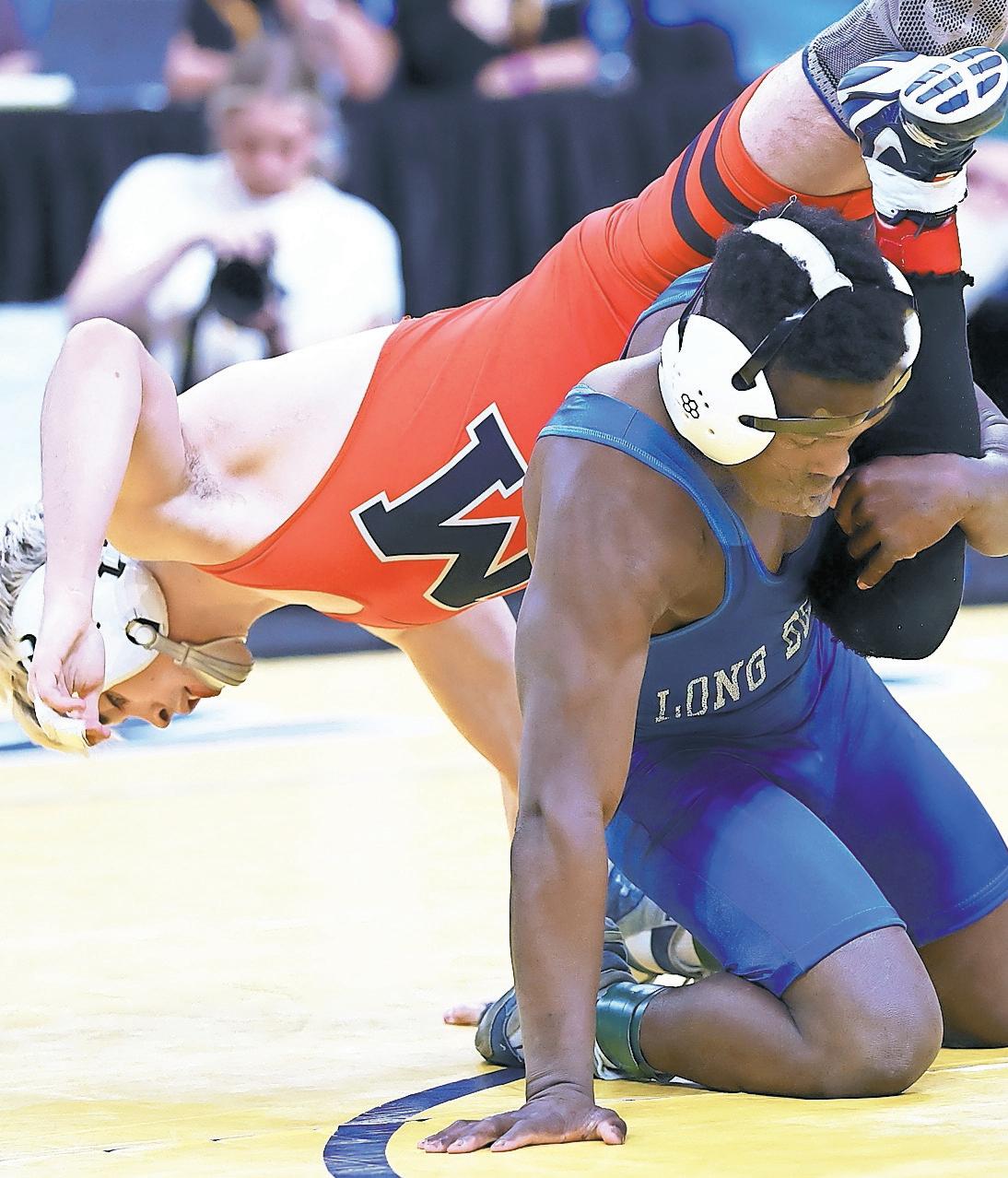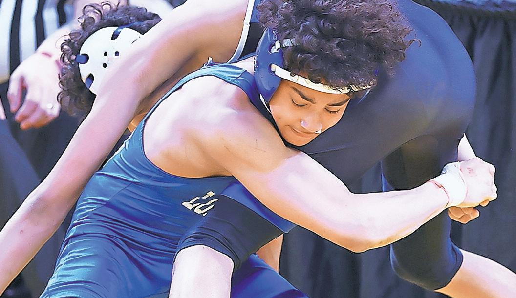 Long Beach High School senior Dunia RodriguezSibomana, in blue, defeated Manhasset’s Will Russell, 7-1, to capture the New York state 118pound wrestling title last Sunday in Albany. Story, more photos, Page 6.