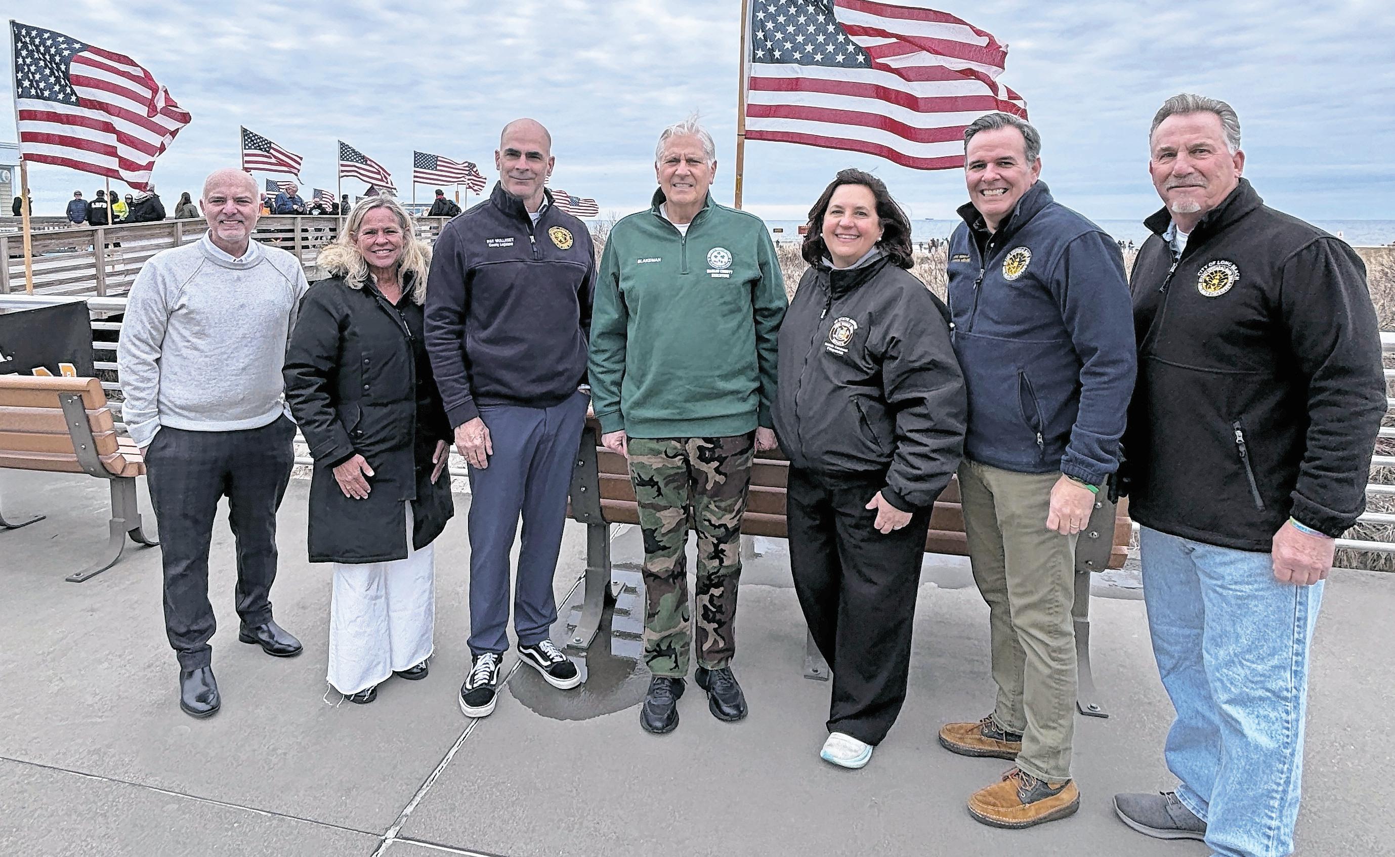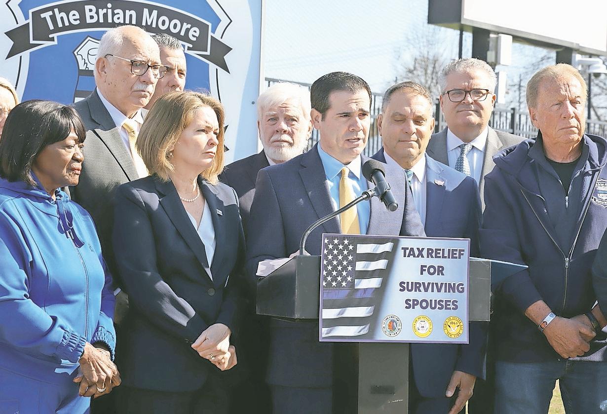 Nassau County’s three town supervisors gathered place at the Brian Moore Athletic Center in Plainedge Park, along with local officials and law enforcement families to highlight a new property tax exemption for surviving spouses of police officers killed in the line of duty.