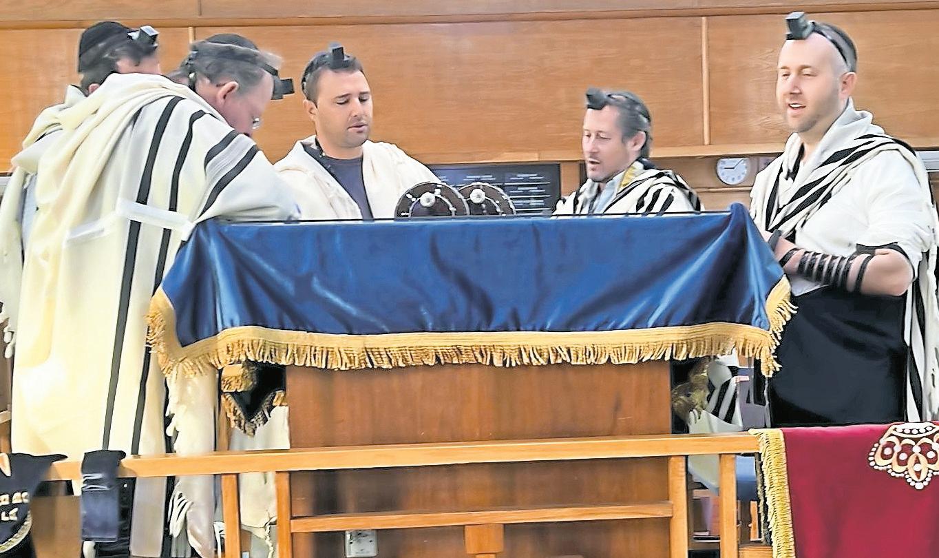 During the Thanksgiving service BACH Gabbai Bryan Adler, left, EMT and volunteer firefighter Yanky Koenig, firefighter and paramedic Lt. Sam Pinto, paramedic B-Z Heller and BACH Rabbi Benny Berlin recite prayers.