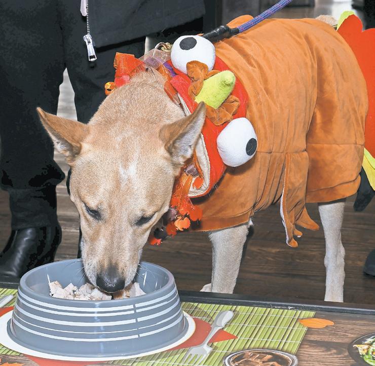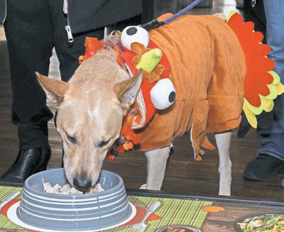 Petey, dressed as a Thanksgiving turkey, enjoyed his holiday feast during the adoption event kickoff.