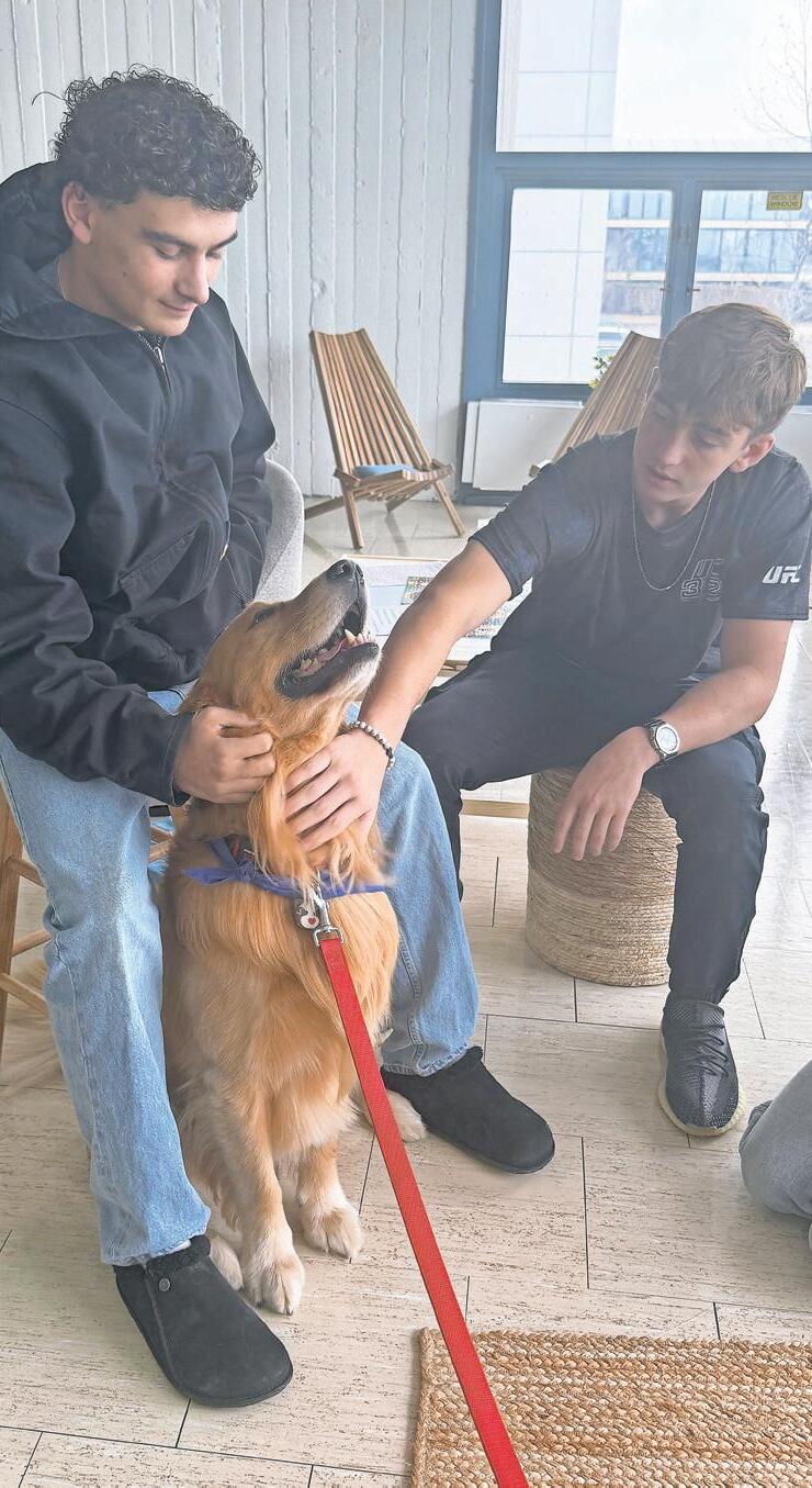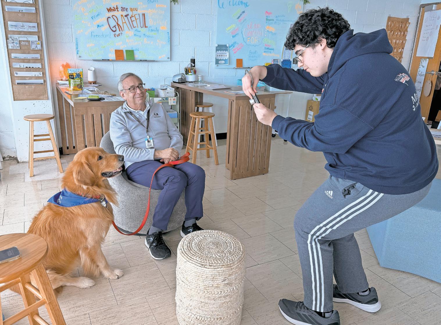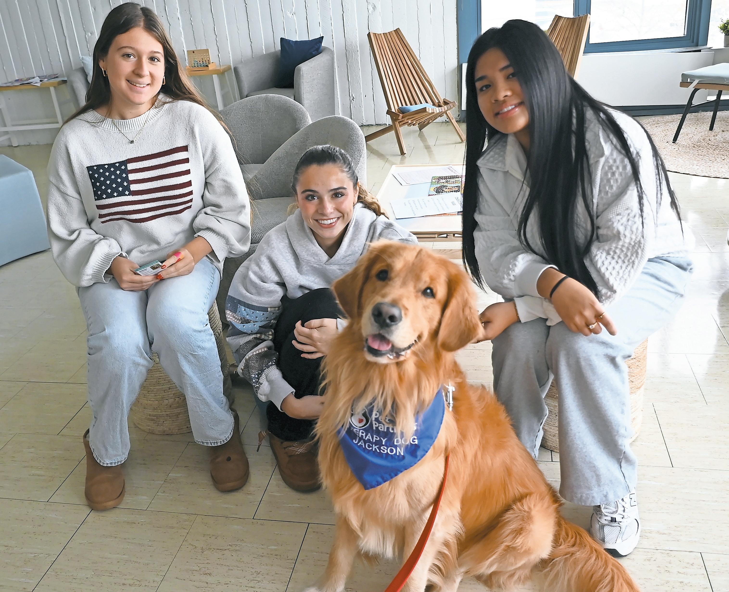Therapy Dog Thursday, a wellness initiative, offered by Pet Partners and Long Beach High School’s newly designed Student Wellness Center, known as the Well, took place on Nov. 20. Above, from left, LBHS students Kylie Duncan, Lilli Carbone and Kaitlyn Bailing with Jackson, a therapy dog. During his visit to the high school, Jackson met student Joseph Lordi, right. Story, more photos, Page 10.