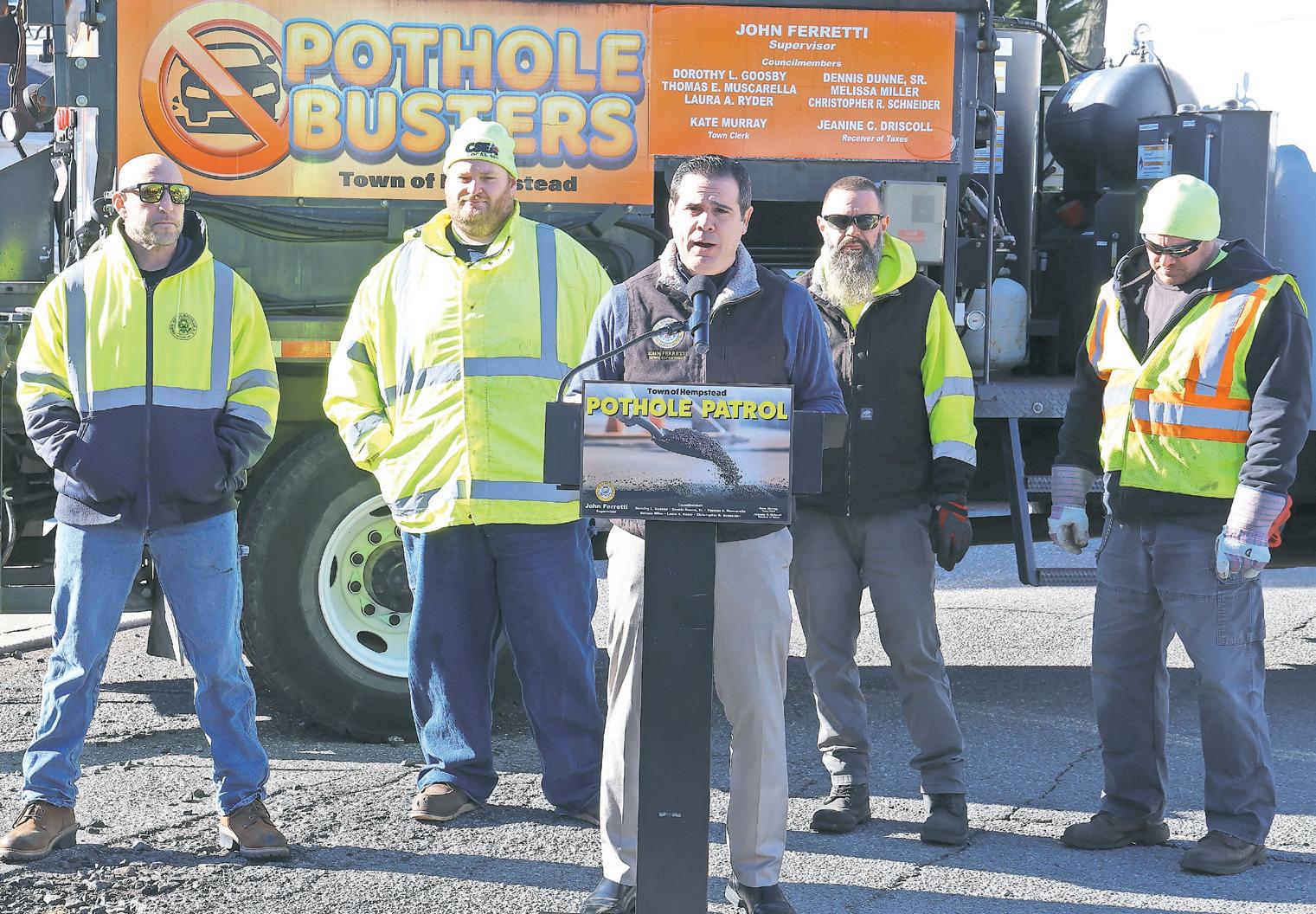 Town Supervisor John Ferretti announced the launch of the town’s Pothole Patrol during a news conference in Merrick, citing repeated freeze-thaw cycles and heavy traffic as the primary causes of pavement deterioration.