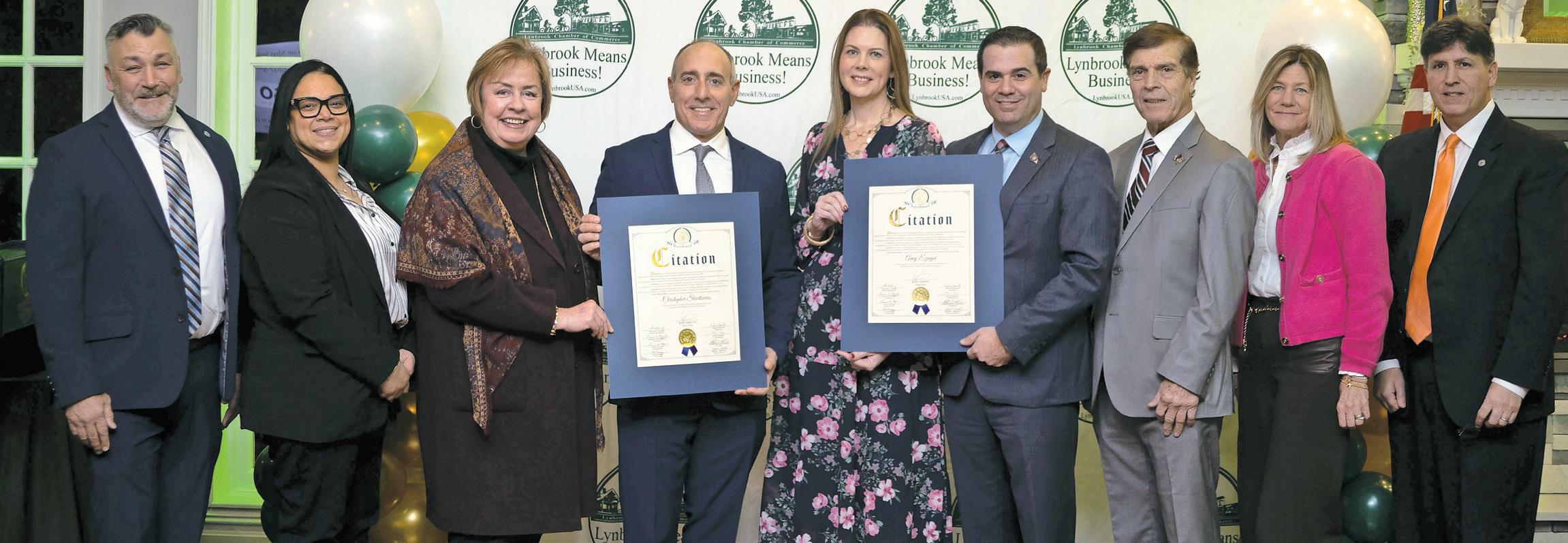 Lynbrook village Trustee Michael Habert, left, Nassau Legislator Cynthia Nuńez, Hempstead Town Clerk Kate Murray, honorees Chris Skartsiaris and Amy Ezagui, Mayor Alan Beach and Trustees Ann Marie Reardon and Robert Boccio.