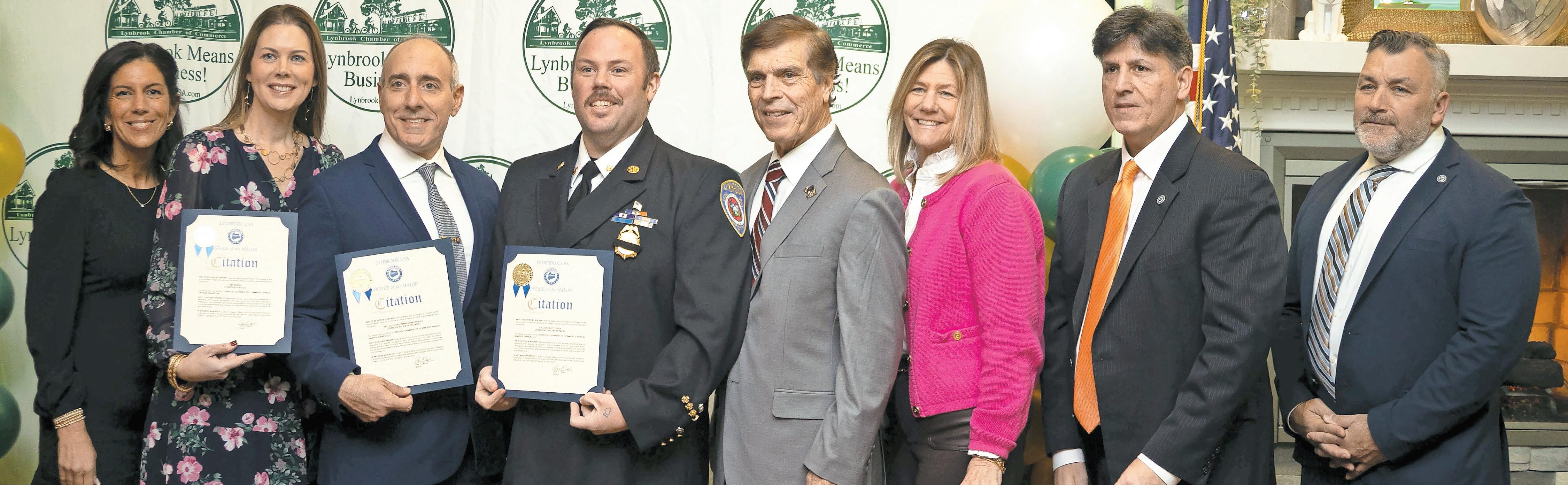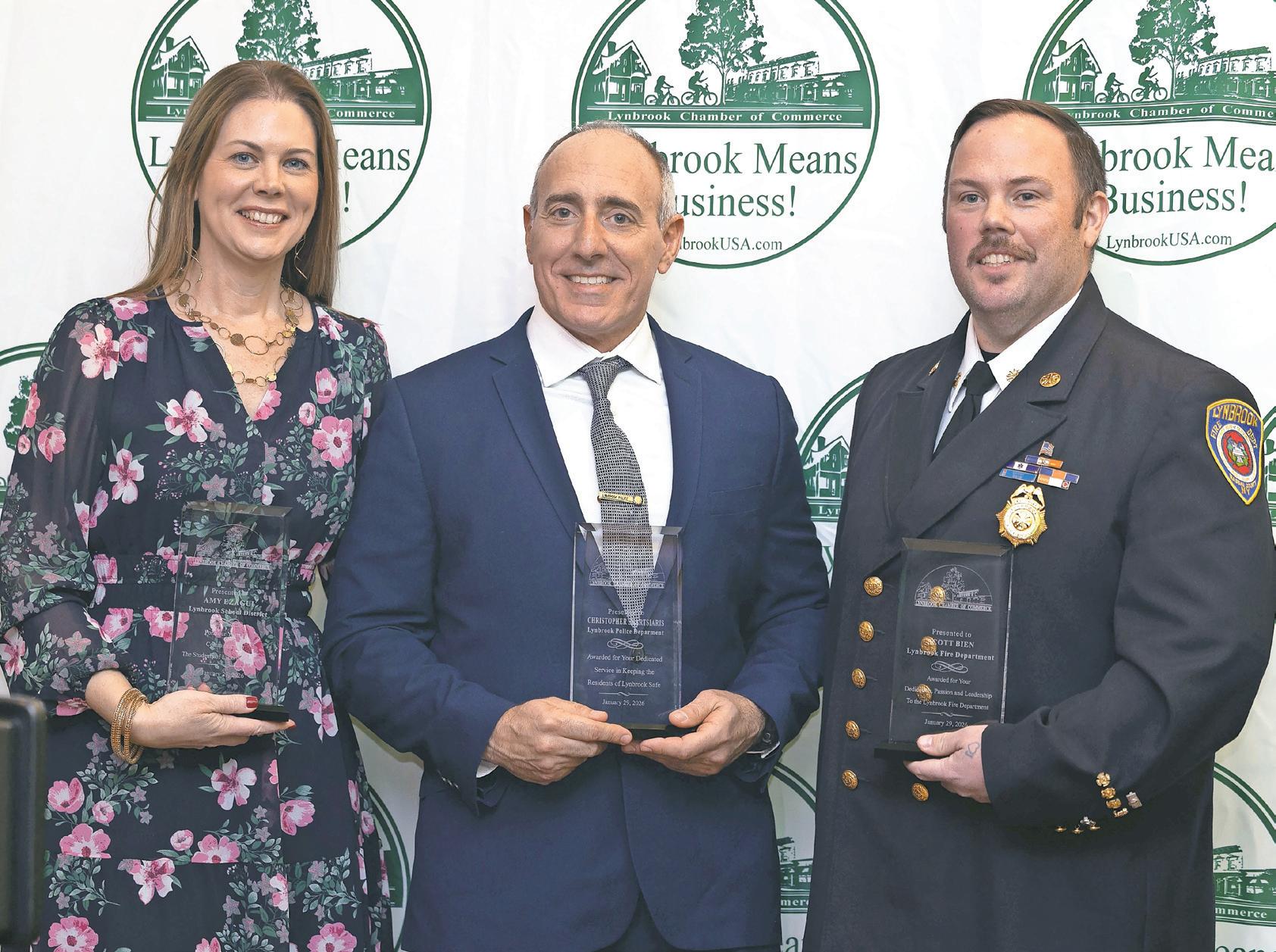 The Lynbrook Chamber of Commerce hosted the annual Evening of Excellence dinner on Jan. 29 at the Coral House in Baldwin, honoring signficant contributions to Lynbrook by educators, first responders and businesses. Above, Amy Ezagui, left, Chris Skartsiaris and Fire Chief Scott Bien were recognized. At right, Chamber President Michela ArgentoSerra addressed the organization’s members and guests at the gala. Story, more photos, Page 3.