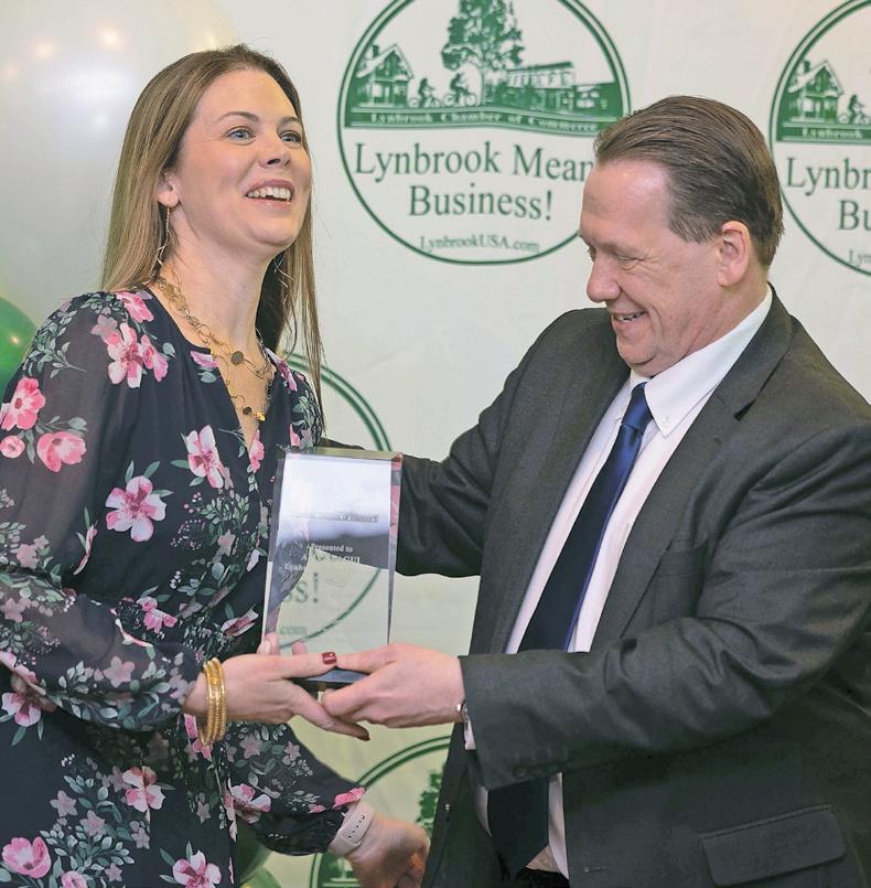 Lynbrook Superintendent Paul Lynch hands Amy Ezagui, a longtime educator and school leader at Lynbrook schools, her chamber award.