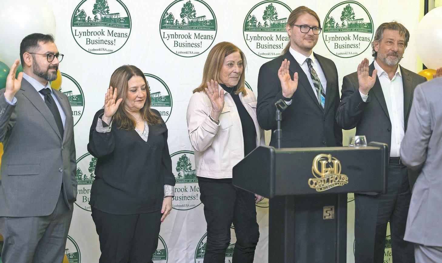 Lynbrook Chamber of Commerce officers Travis Stockman, left, Diane Dries, Rhonda Glickman, Eric Donaldson and Lloyd Chrein take the oath of office.