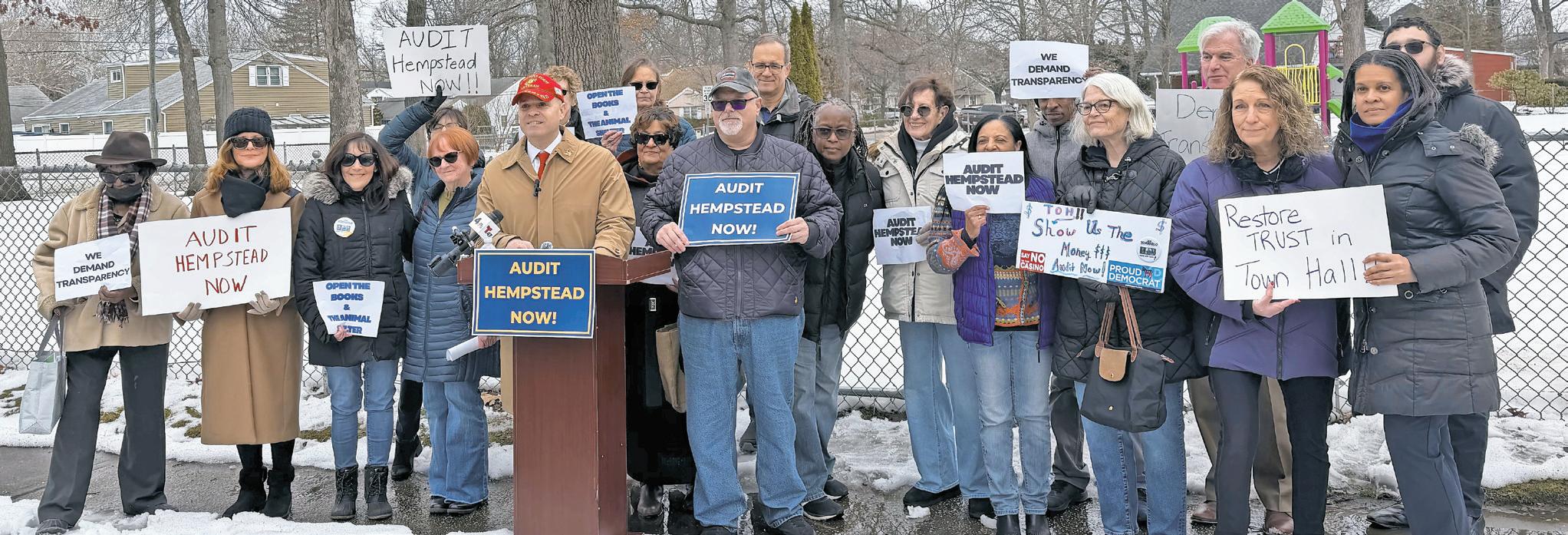 Residents from the Town of Hempstead with Joseph Scianablo, center, the Democratic candidate for supervisor, called for an independent state audit of alleged missing financial reports.