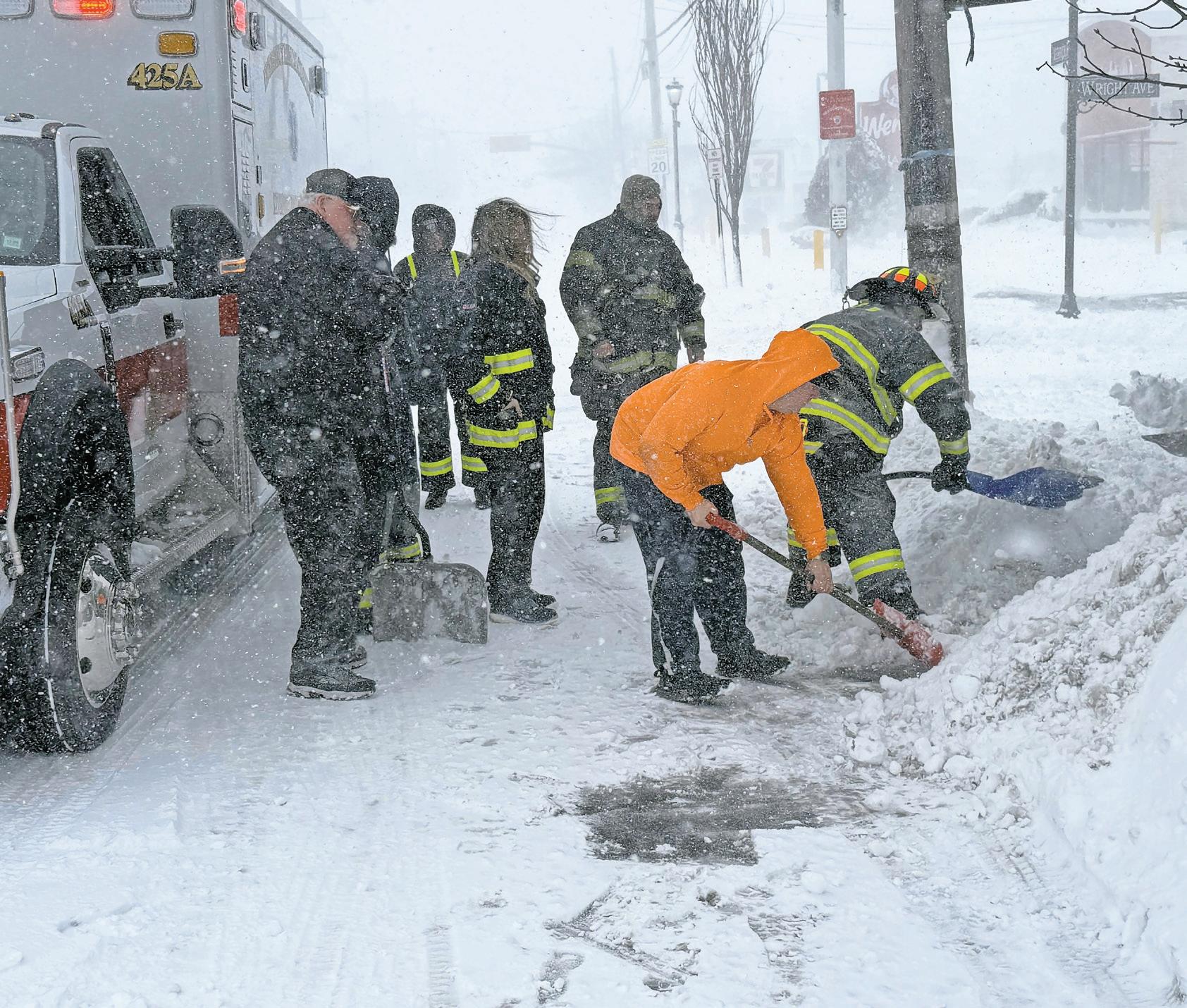 Lynbrook firefighters and emergency medical technicians dug through snow Monday morning on Merrick Road to reach the residence of a 3-month-old who was taken to a hospital by the department’s Emergency Medical Company.