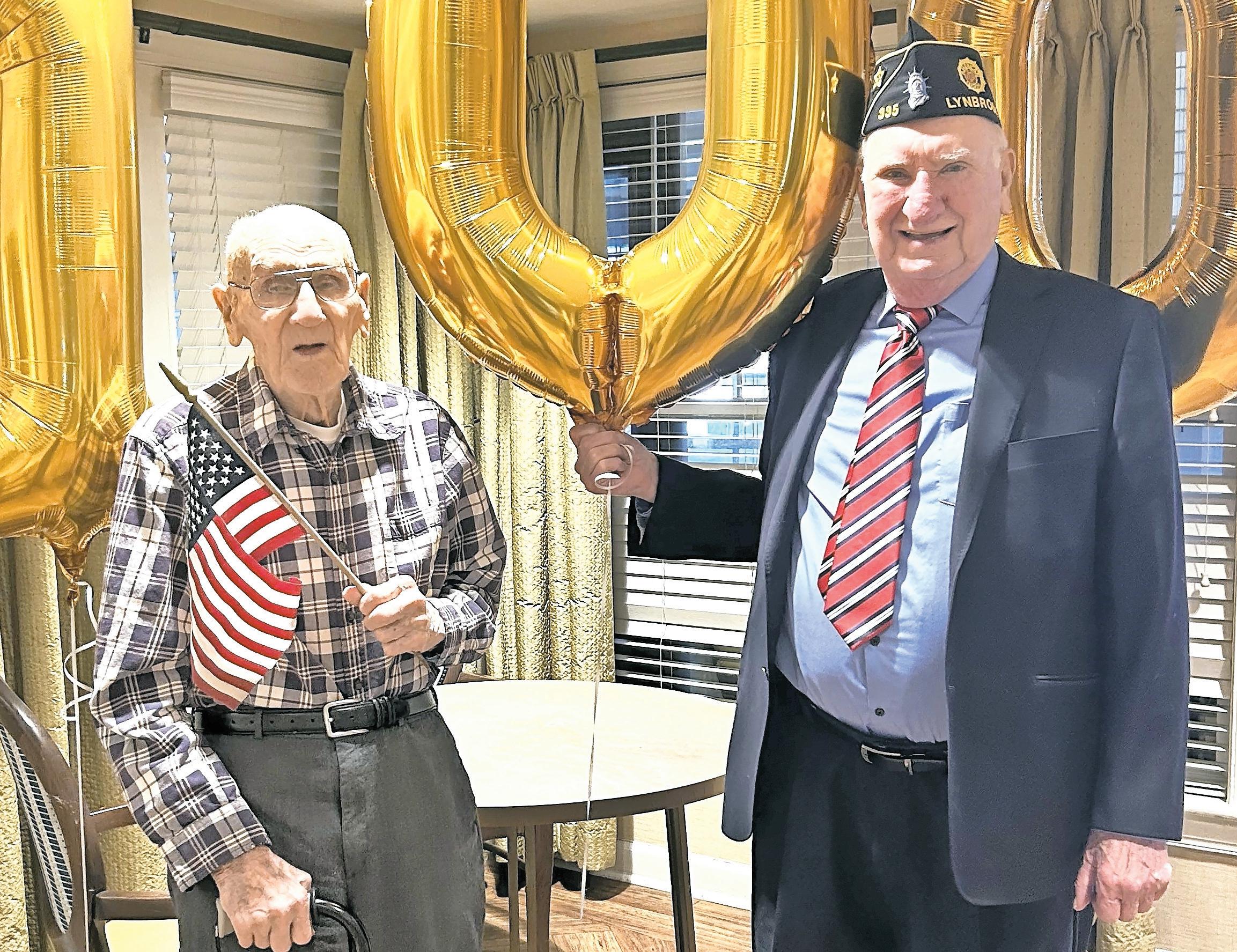 World War II veteran Ed Schilling, left, celebrates his birthday as Lynbrook American Legion Post 335 member Dennis Duffy, right, offers congratulations on behalf of the post and fellow veterans.