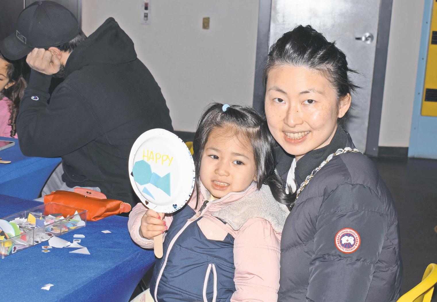 Ava Zaman, 3, of Lynbrook, and her mother, Tiffany Leung, attend a Purim celebration at the Long Island Children’s Museum on March 1, where families enjoyed music, crafts and festive activities