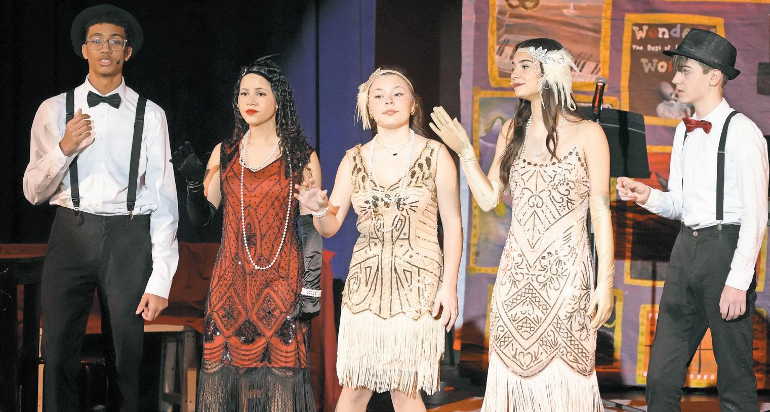 Sophomores Harlow Tyrell, left, Alexis Martinez, Amelia Distefano, Julianna Thorgersen and Sean Lynch perform their entrance production, “Bourbon Street Never Sleeps,” during Rock Rivalry.