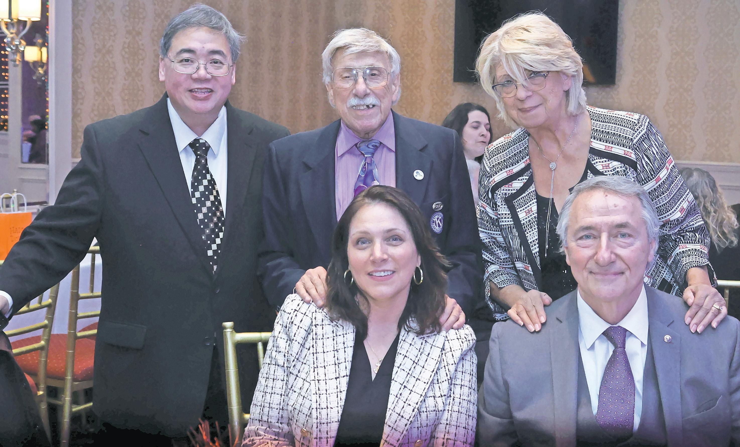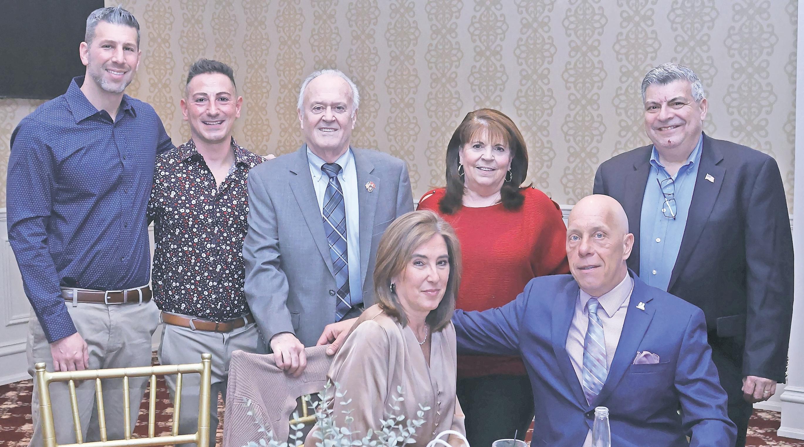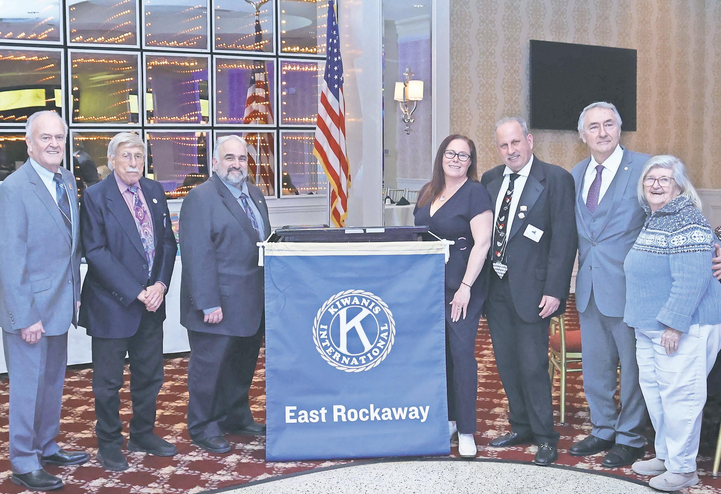 East Rockaway Mayor Gordon Fox, far left, Past Kiwanis Gov. Joe Corace, President Michael Califano, Chair Theresa Gaffney, Long Island Southwest Lt. Gov. Michael Gliner, Past Gov. Joe Ruggerio and Past Lt. Gov. Ethel Gilloon were among the attendees at the East Rockaway Kiwanis Club’s 75th anniversary event.