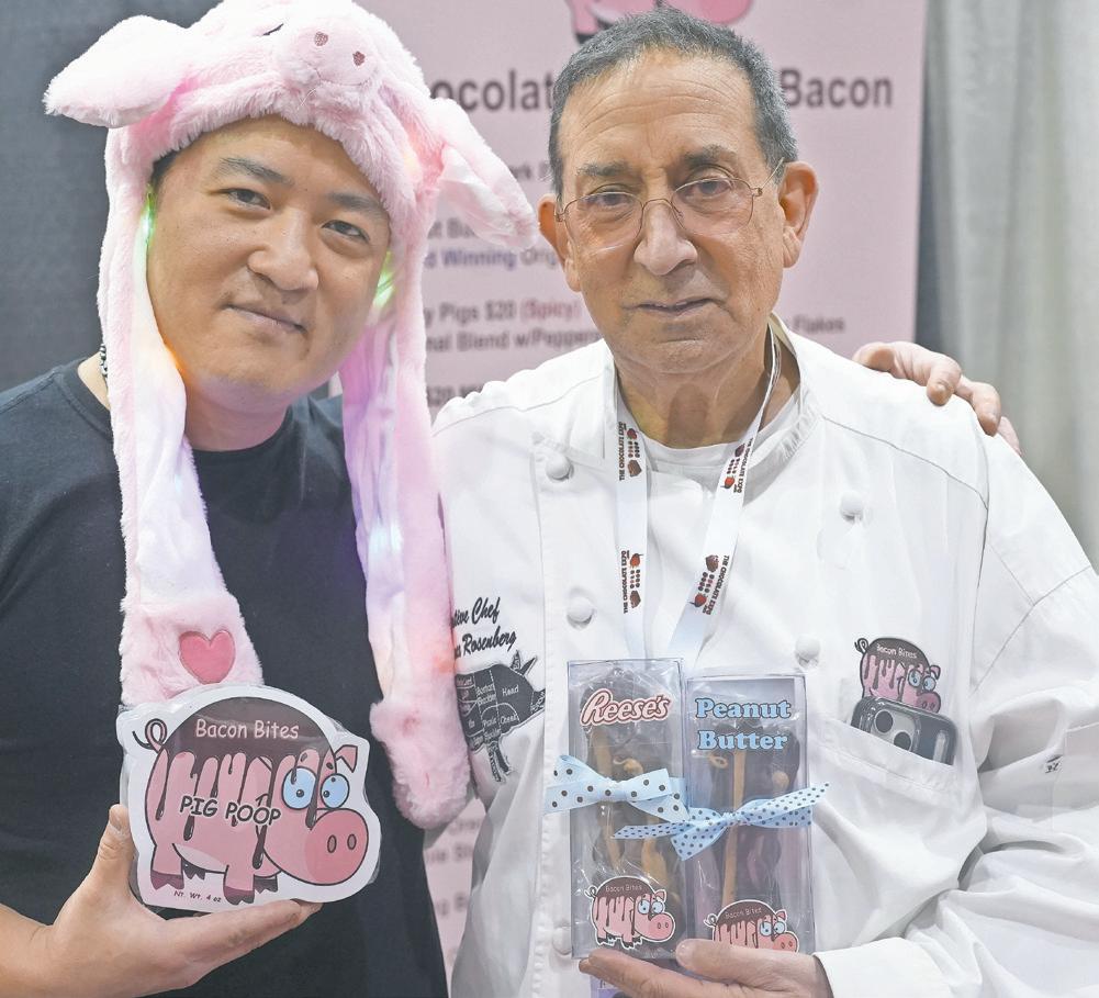 and executive chef Lawrence Rosenberg hold Reese’s and peanut butter Bacon Bites, a sweetand-savory treat. Rosenberg’s product is made from real bacon and enrobed with chocolate.