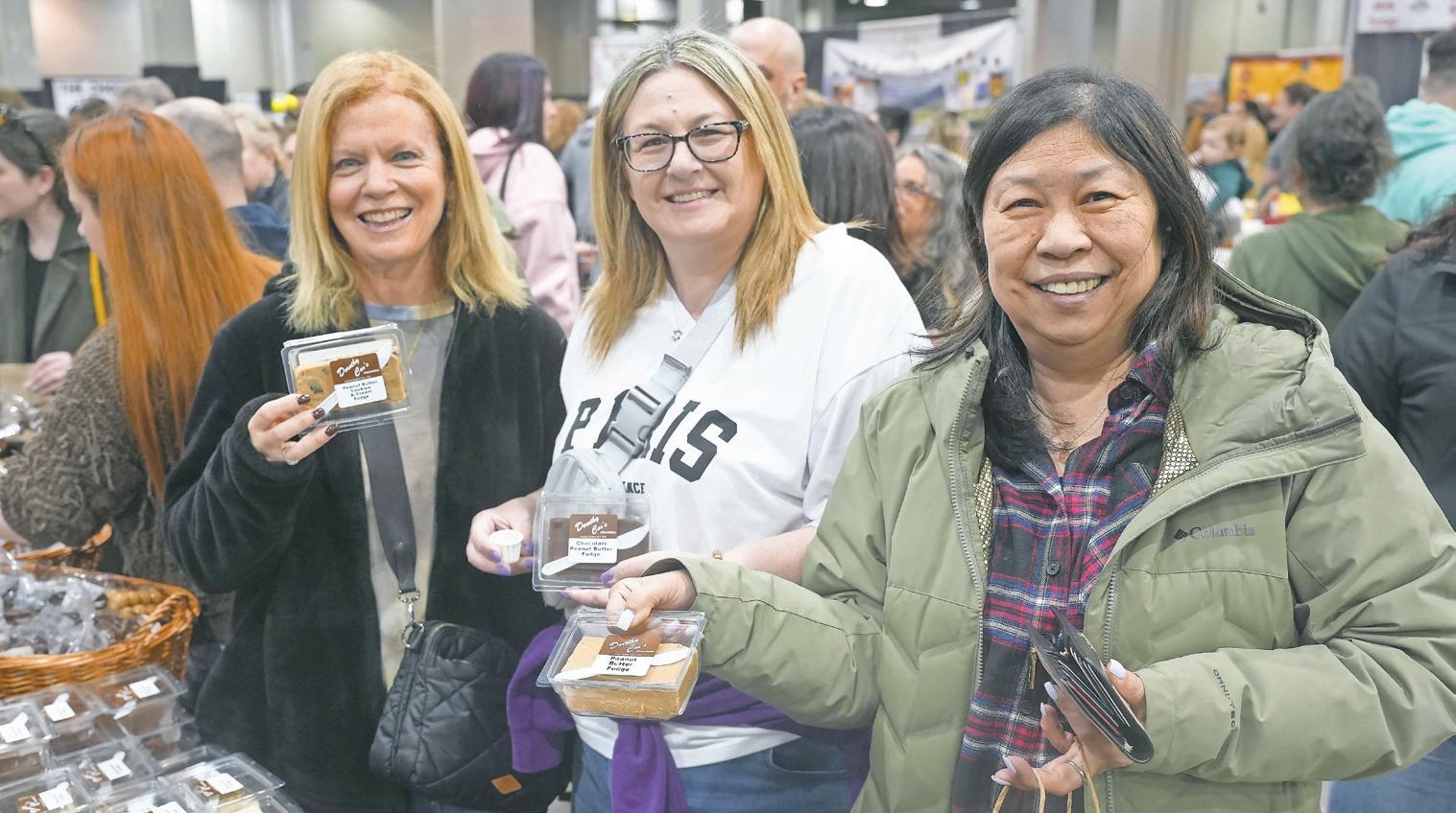 Debra Warshaw, left, and Gayle Zweback, both of Plainview, and Esther Almeraris of Floral Park hold chocolates from Dorothy Cox’s Chocolates. The chocolate vendor is a family business in Massachusetts.