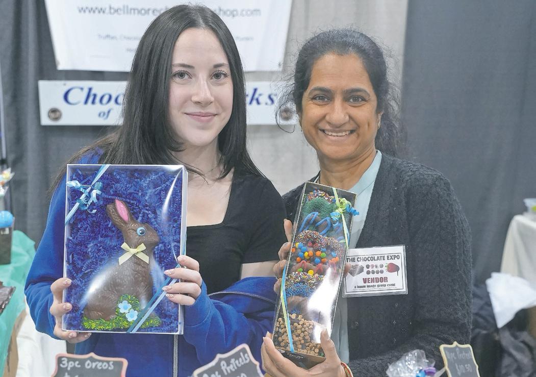 Samantha Phillips, left, and Nimisha Patel of Chocolate Works in Bellmore, which offers handcrafted Belgian chocolates, chocolate-covered pretzels, gift baskets and other sweets show case their products. The store displayed gift baskets for Easter and other chocolate-covered products.