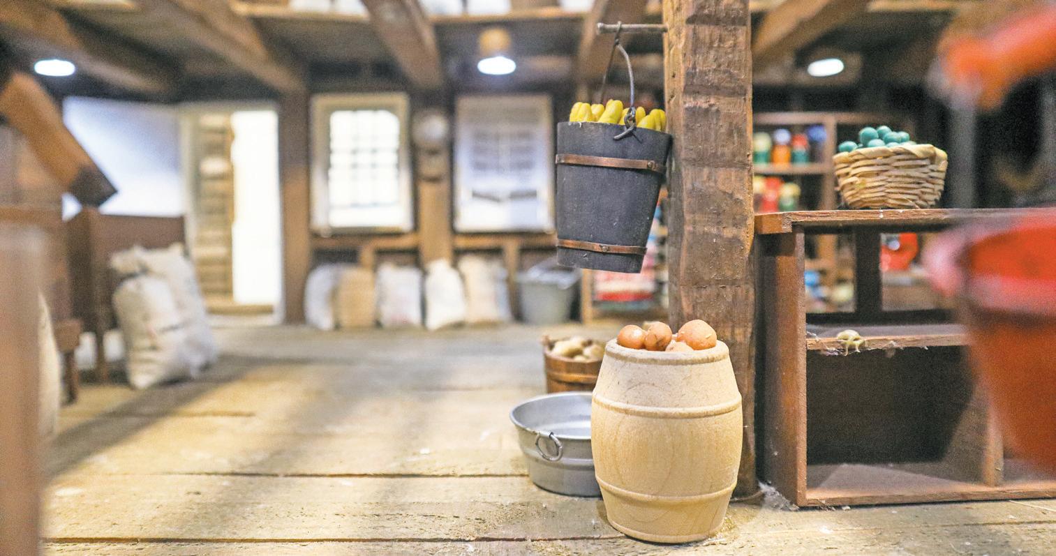 The miniature captures the defining features of the original mill, including its waterwheel, sloped roof, and wooden siding. A small crowd of figures is included in the display to illustrate the scale of the building and the community that would have interacted with it.