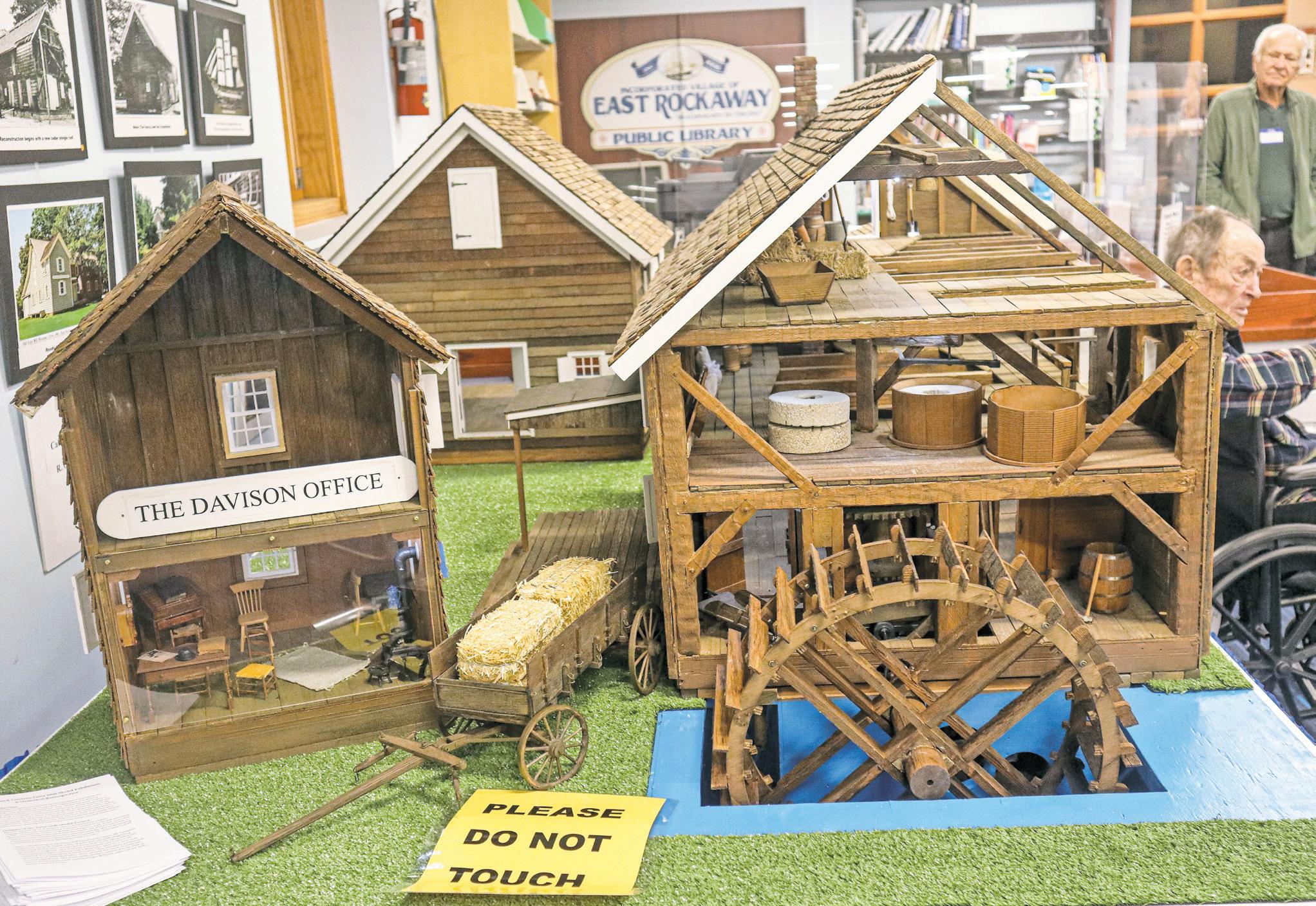 The miniature replica of the Old Grist Mill was displayed at the East Rockaway Public Library, highlighting the structure’s waterwheel and architectural features.