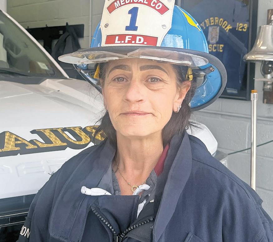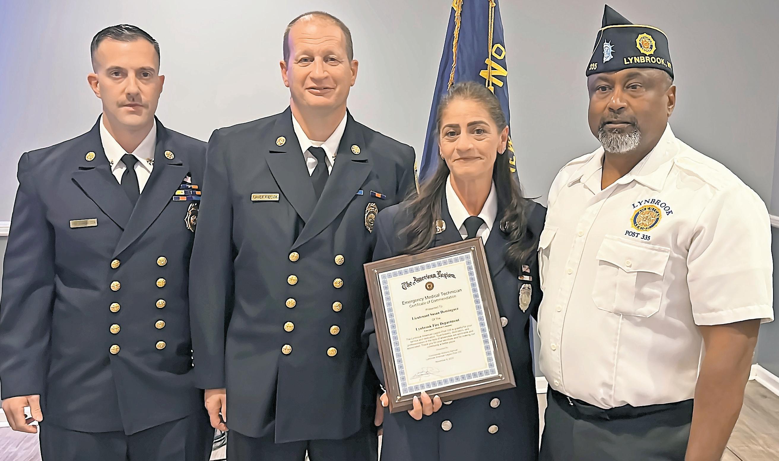 Post 335 Commander Anthony Samuel presented an award to First Lieutenant Susan Dominguez of the Lynbrook Fire Department’s Emergency Medical Company for her lifesaving efforts during Law and Order Night on Nov. 6.