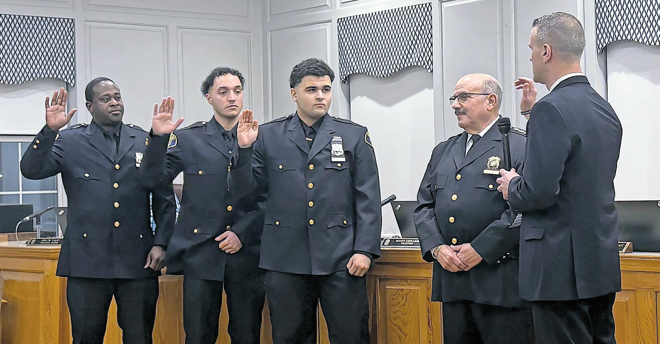 At the Mar. 4 meeting of the Malverne Village Board of Trustees Mayor Tim Sullivan and Chief of Police Reserves Robert Oliva swore in three new Police Reserve Officers.