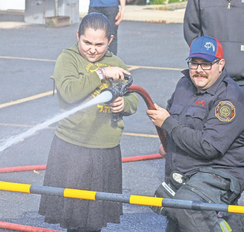 Firefighter Nick Avila shows Bracha Taub, 11, how to use the fire hose.