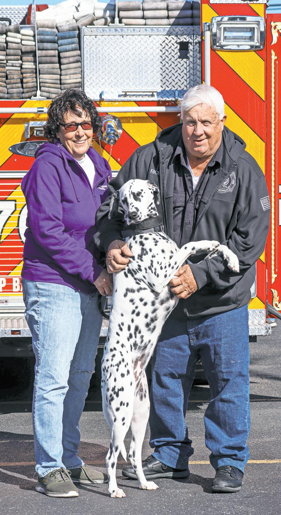 Firefighter Richard Bonacorsa and Karen, with their dalmatian Mabel. Mabel is 15 months, deaf, and a rescue.