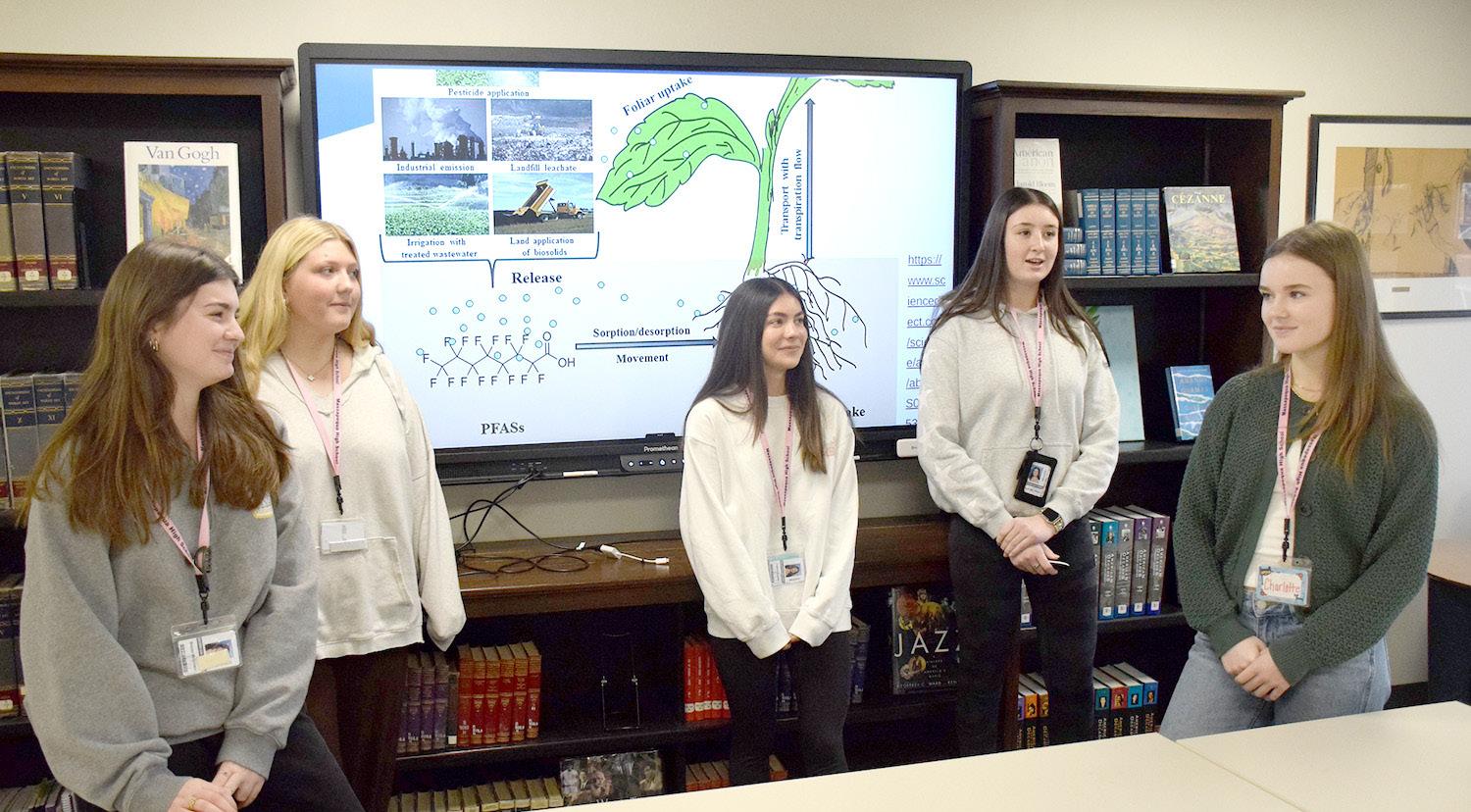 The team of Casey Goldthwaite, Brooke McGovern, Charlotte Pachucki, Valeria Suarez and Shannon Walsh did research on PFAs, or forever chemicals, found in clothing. Their perspectives included the effects of chemicals on the environment and on consumers, as well as laws governing PFAs. After completing research on their individual components, the five sophomores came together to create a cohesive report and digital presentation.