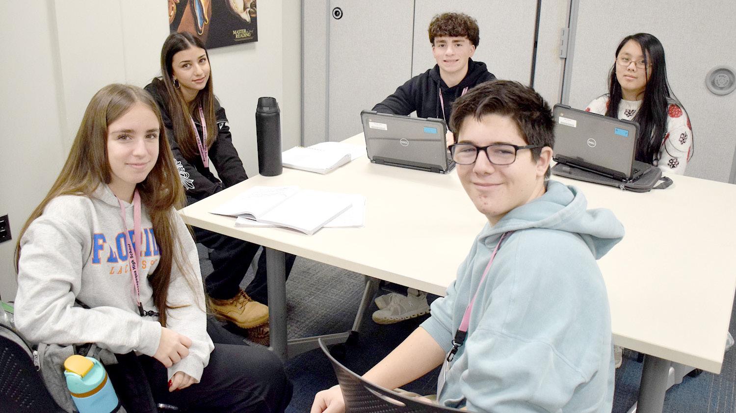 Left: AP Seminar students, from left, Ava Comiskey, Sharlotte Kelter, John Moran, Jack Findling and Snowe Ma met to finalize their project, which would be presented to teachers and recorded for the College Board.
