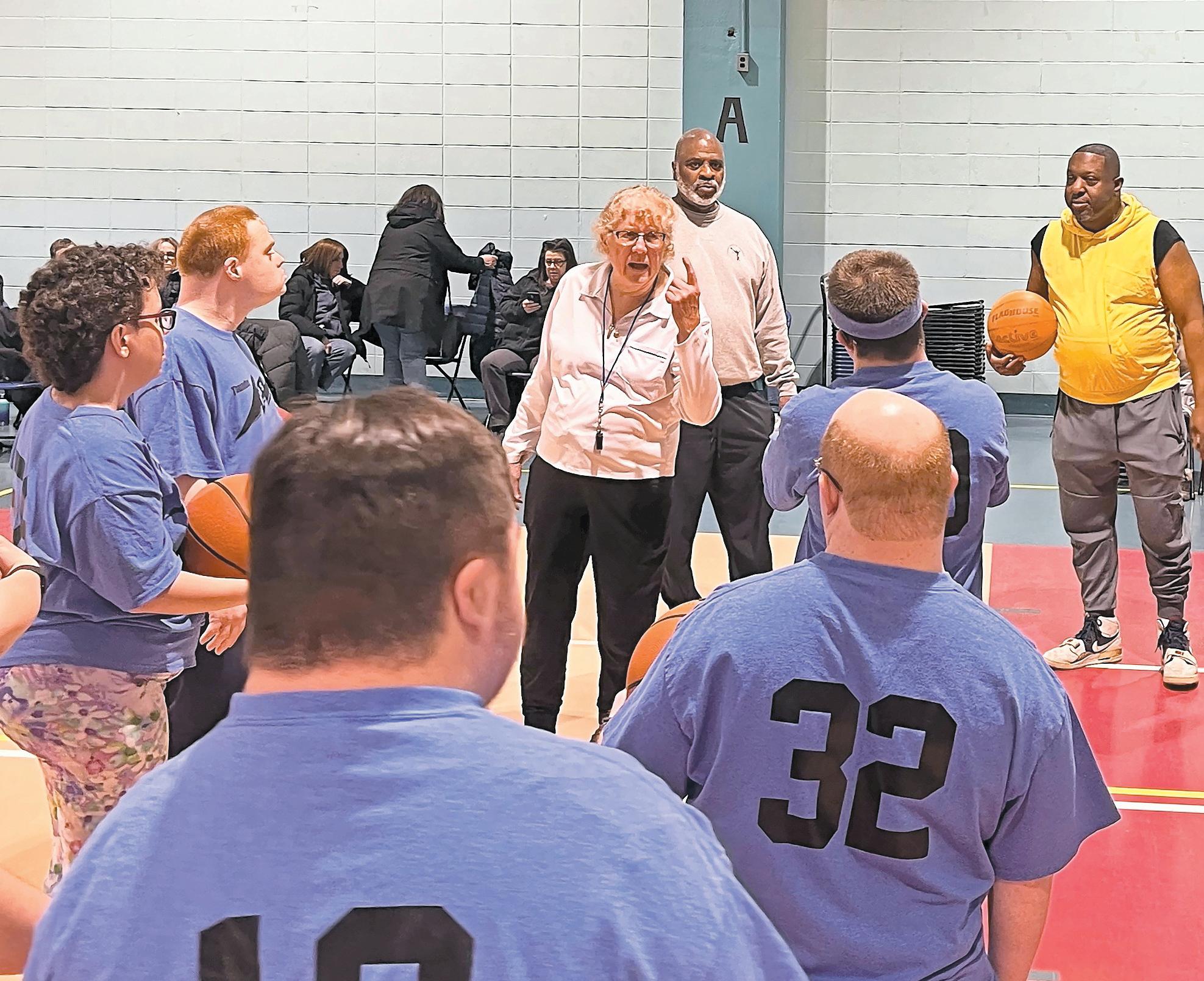 Basketball players on the Association for Children with Down Syndrome Thunderbolts team, in blue, and Freeport-Merrick Rotary Club team, in yellow, get a pregame rundown on the rules and loosen up by stretching.