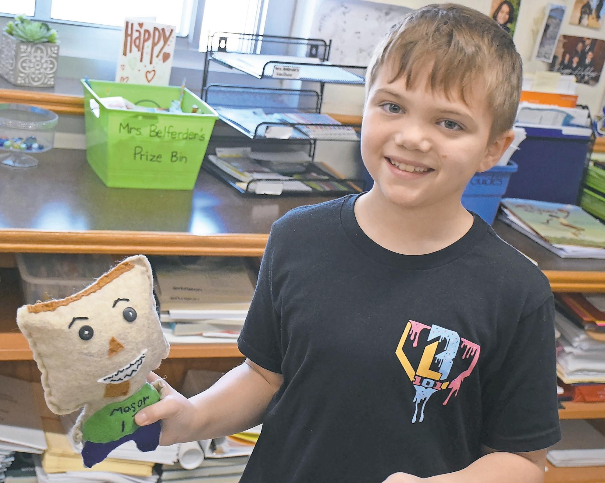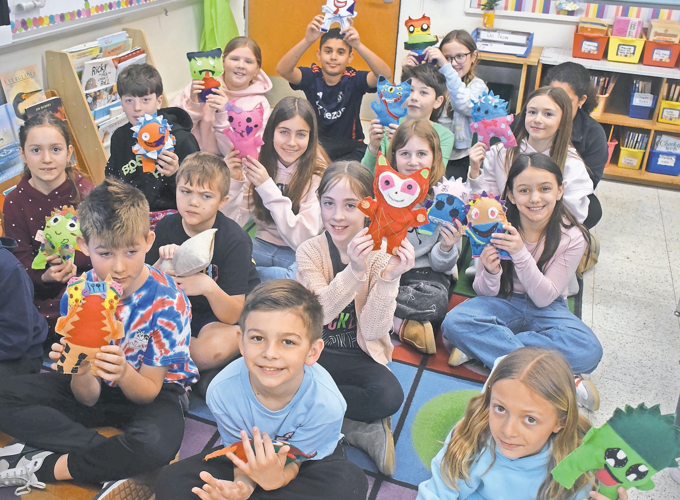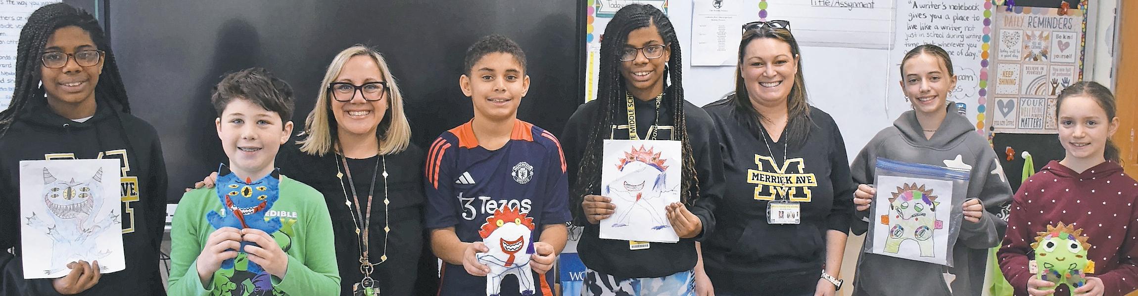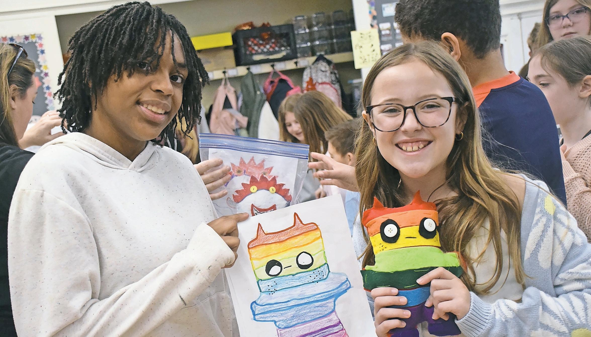 Fourth graders at Newbridge Road Elementary School received the creations on March 13, when seventh- and eighth-grade students from Merrick Avenue Middle School visited to distribute the sewn projects based on monster drawings completed earlier in the school year.