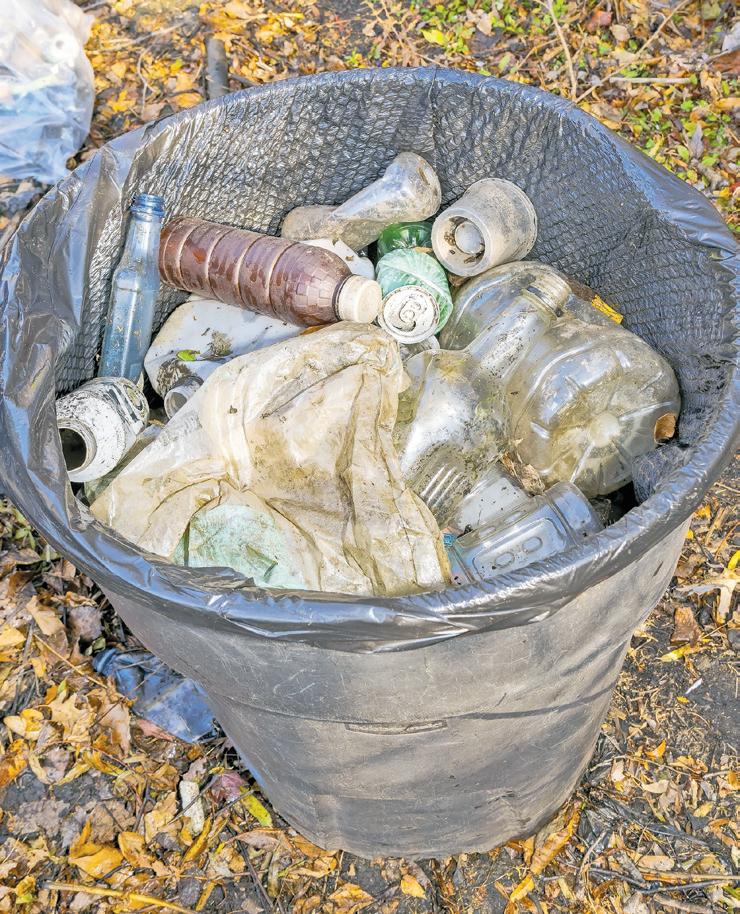 Plastic bottles filled a garbage pail during the Mullener Pond cleanup in North Merrick, where volunteers removed more than 80 bags of debris.